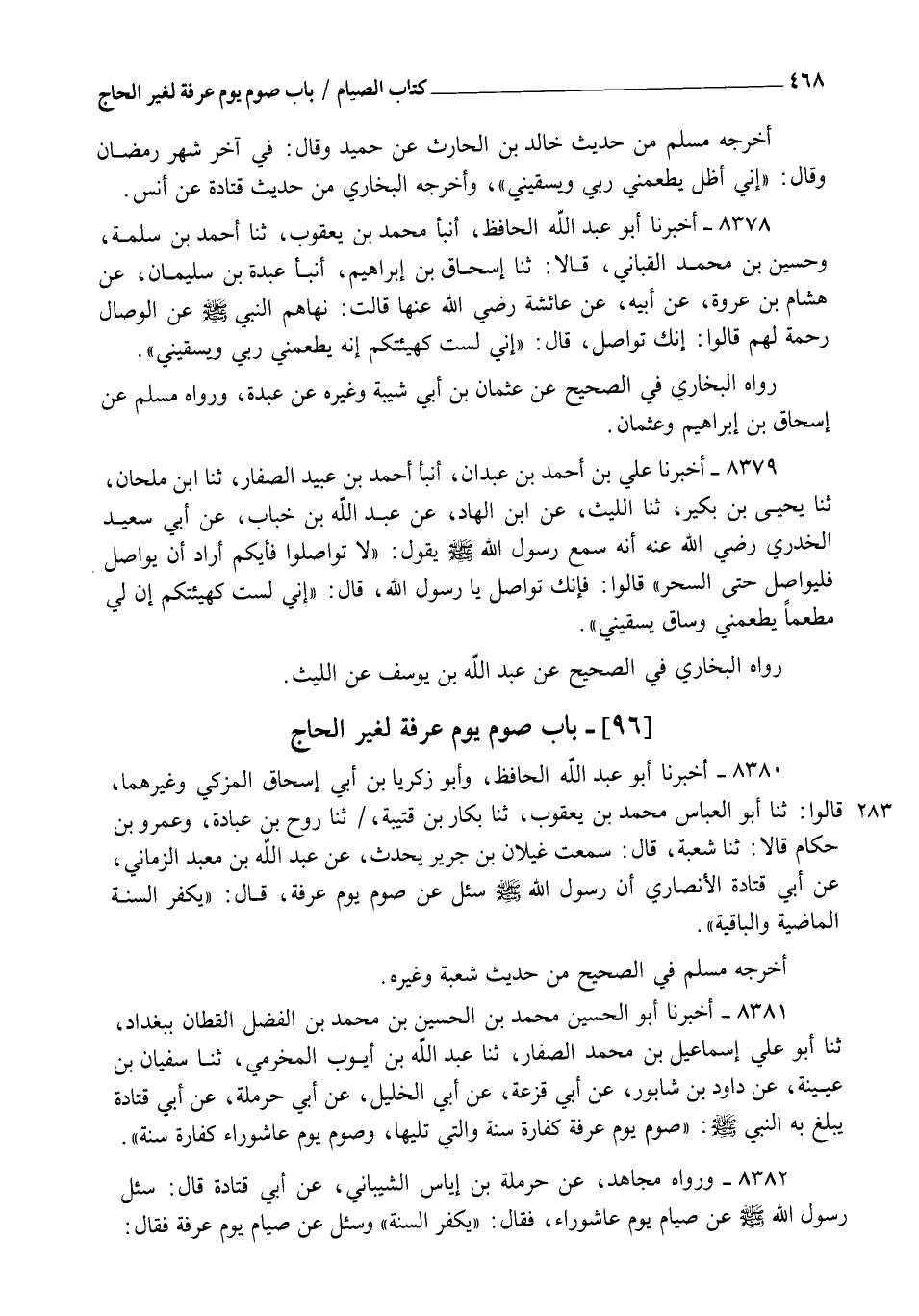 8380 - أَخْبَرَنَا أَبُو عَبْدِ اللهِ الْحَافِظُ، وَأَبُو زَكَرِيَّا بْنُ أَبِي إِسْحَاقَ الْمُزَكِّي وَغَيْرُهُمَا قَالُوا: ثنا أَبُو الْعَبَّاسِ مُحَمَّدُ بْنُ يَعْقُوبَ , ثنا بَكَّارُ بْنُ قُتَيْبَةَ، ثنا رَوْحُ بْنُ عُبَادَةَ، وَعَمْرُو بْنُ حَكَّامٍ، قَالَا: ثنا شُعْبَةُ، قَالَ: سَمِعْتُ غَيْلَانَ بْنَ جَرِيرٍ، يُحَدِّثُ عَنْ عَبْدِ اللهِ بْنِ مَعْبَدٍ الزِّمَّانِيِّ، عَنْ أَبِي قَتَادَةَ الْأَنْصَارِيِّ أَنَّ رَسُولَ اللهِ صَلَّى اللهُ عَلَيْهِ وَسَلَّمَ سُئِلَ عَنْ صَوْمِ يَوْمِ عَرَفَةَ قَالَ: §" يُكَفِّرُ السَّنَةَ الْمَاضِيَةَ وَالْبَاقِيَةَ " أَخْرَجَهُ مُسْلِمٌ فِي الصَّحِيحِ مِنْ حَدِيثِ شُعْبَةَ وَغَيْرِهِ