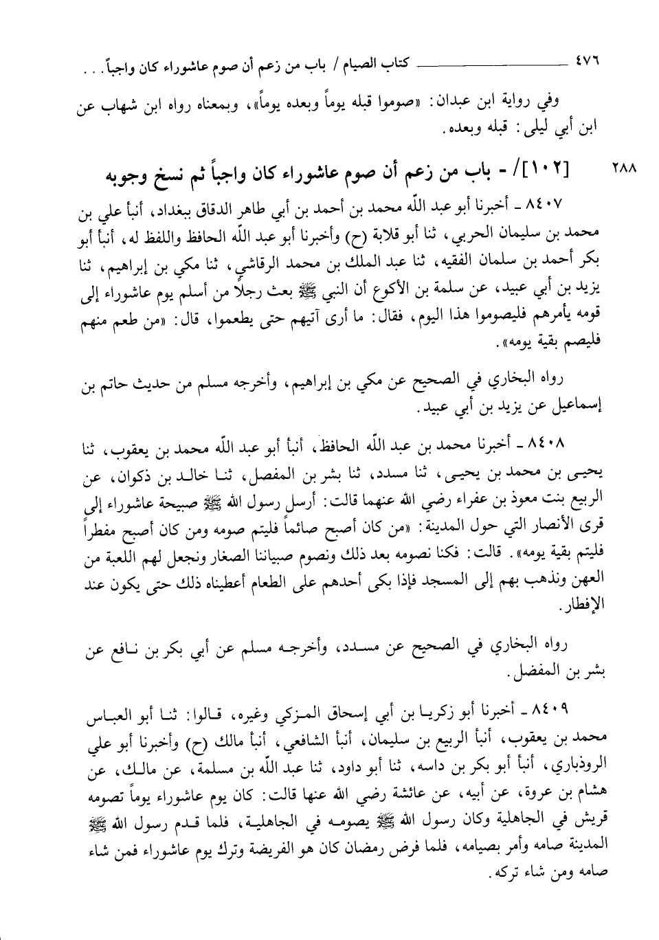 8407 - أَخْبَرَنَا أَبُو عَبْدِ اللهِ مُحَمَّدُ بْنُ أَحْمَدَ بْنِ أَبِي طَاهِرٍ الدَّقَّاقُ بِبَغْدَادَ , أنبأ عَلِيُّ بْنُ مُحَمَّدِ بْنِ سُلَيْمَانَ الْحَرْبِيُّ، ثنا أَبُو قِلَابَةَ، ح وَأَخْبَرَنَا أَبُو عَبْدِ اللهِ الْحَافِظُ، وَاللَّفْظُ لَهُ , أنبأ أَبُو بَكْرٍ أَحْمَدُ بْنُ سَلْمَانَ الْفَقِيهُ , ثنا عَبْدُ الْمَلِكِ بْنُ مُحَمَّدٍ الرَّقَاشِيُّ، ثنا مَكِّيُّ بْنُ إِبْرَاهِيمَ، ثنا يَزِيدُ بْنُ أَبِي عُبَيْدٍ، عَنْ سَلَمَةَ بْنِ الْأَكْوَعِ أَنَّ النَّبِيَّ صَلَّى اللهُ عَلَيْهِ وَسَلَّمَ بَعَثَ رَجُلًا مِنْ أَسْلَمَ يَوْمَ عَاشُورَاءَ إِلَى قَوْمِهِ يَأْمُرُهُمْ فَلْيَصُومُوا هَذَا الْيَوْمَ، فَقَالَ: مَا أَرَى آتِيَهُمْ حَتَّى يَطْعَمُوا , قَالَ: §" مَنْ طَعِمَ مِنْهُمْ فَلْيَصُمْ بَقِيَّةَ يَوْمِهِ " رَوَاهُ الْبُخَارِيُّ فِي الصَّحِيحِ عَنْ مَكِّيِّ بْنِ إِبْرَاهِيمَ وَأَخْرَجَهُ مُسْلِمٌ مِنْ حَدِيثِ حَاتِمِ بْنِ إِسْمَاعِيلَ عَنْ يَزِيدَ بْنِ أَبِي عُبَيْدٍ