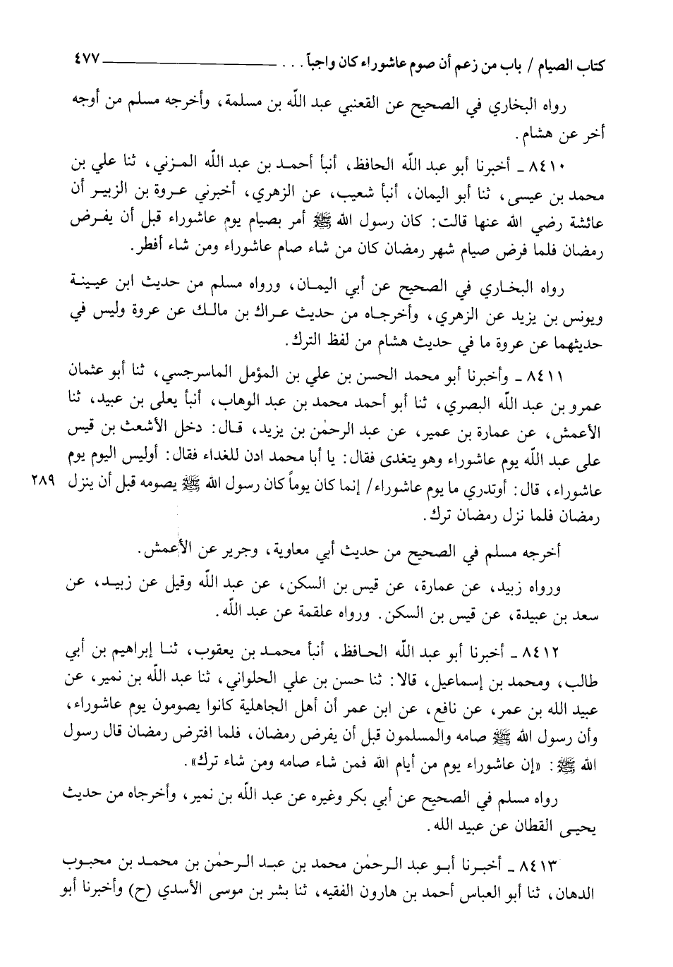 8411 - وَأَخْبَرَنَا أَبُو مُحَمَّدٍ الْحَسَنُ بْنُ عَلِيِّ بْنِ الْمُؤَمَّلِ الْمَاسَرْجِسِيُّ، ثنا أَبُو عُثْمَانَ عَمْرُو بْنُ عَبْدِ اللهِ الْبَصْرِيُّ , ثنا أَبُو أَحْمَدَ مُحَمَّدُ بْنُ عَبْدِ الْوَهَّابِ , أنبأ يَعْلَى بْنُ عُبَيْدٍ , ثنا الْأَعْمَشُ، عَنْ عُمَارَةَ بْنِ عُمَيْرٍ، عَنْ عَبْدِ الرَّحْمَنِ بْنِ يَزِيدَ قَالَ: دَخَلَ الْأَشْعَثُ بْنُ قَيْسٍ عَلَى عَبْدِ اللهِ يَوْمَ عَاشُورَاءَ وَهُوَ يَتَغَدَّى فَقَالَ: يَا أَبَا مُحَمَّدٍ ادْنُ لِلْغَدَاءِ فَقَالَ أَوَلَيْسَ الْيَوْمُ يَوْمَ عَاشُورَاءَ؟ قَالَ: أَوَتَدْرِي مَا يَوْمُ عَاشُورَاءَ؟ إِنَّمَا كَانَ يَوْمًا كَانَ رَسُولُ اللهِ صَلَّى اللهُ عَلَيْهِ وَسَلَّمَ §يَصُومُهُ قَبْلَ أَنْ يَنْزِلَ رَمَضَانُ فَلَمَّا نَزَلَ رَمَضَانُ تَرَكَ. أَخْرَجَهُ مُسْلِمٌ فِي الصَّحِيحِ مِنْ حَدِيثِ أَبِي مُعَاوِيَةَ وَجَرِيرٍ عَنِ الْأَعْمَشِ وَرَوَاهُ زُبَيْدٌ عَنْ عُمَارَةَ عَنْ قَيْسِ بْنِ السَّكَنِ عَنْ عَبْدِ اللهِ وَقِيلَ: عَنْ زُبَيْدٍ عَنْ سَعْدِ بْنِ عُبَيْدَةَ عَنْ قَيْسِ بْنِ السَّكَنِ , وَرَوَاهُ عَلْقَمَةُ عَنْ عَبْدِ اللهِ