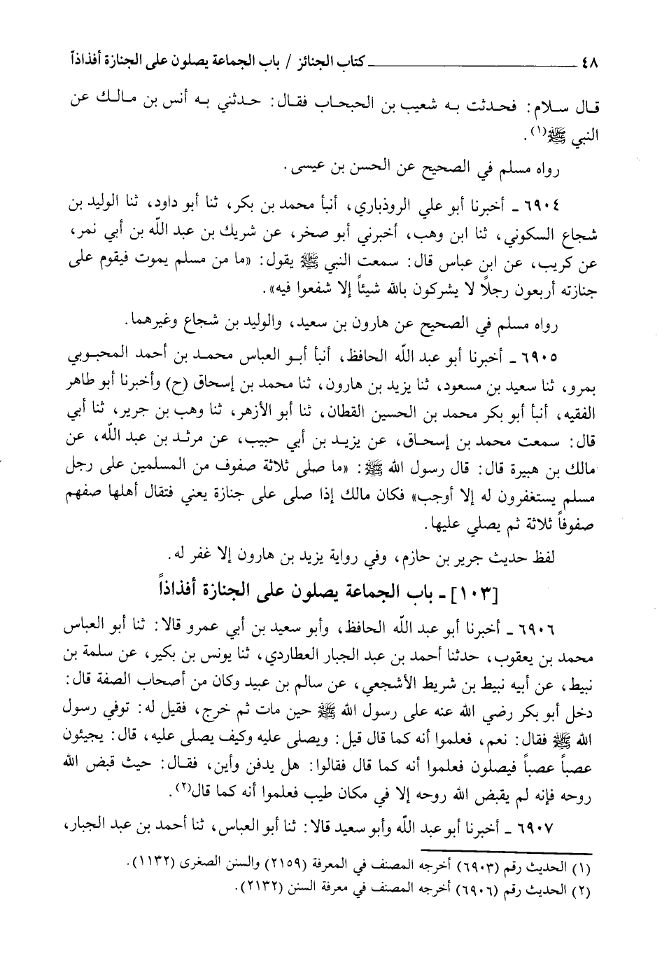 6905 - أَخْبَرَنَا أَبُو عَبْدِ اللهِ الْحَافِظُ، أنبأ أَبُو الْعَبَّاسِ مُحَمَّدُ بْنُ أَحْمَدَ الْمَحْبُوبِيُّ بِمُرْوٍ، ثنا سَعِيدُ بْنُ مَسْعُودٍ، ثنا يَزِيدُ بْنُ هَارُونَ، ثنا مُحَمَّدُ بْنُ إِسْحَاقَ، ح وَأَخْبَرَنَا أَبُو طَاهِرٍ الْفَقِيهُ، أنبأ أَبُو بَكْرٍ مُحَمَّدُ بْنُ الْحُسَيْنِ الْقَطَّانُ، ثنا أَبُو الْأَزْهَرِ، ثنا وَهْبُ بْنُ جَرِيرٍ، ثنا أَبِي، قَالَ: سَمِعْتُ مُحَمَّدَ بْنَ إِسْحَاقَ، عَنْ يَزِيدَ بْنِ أَبِي حَبِيبٍ، عَنْ مَرْثَدِ بْنِ عَبْدِ اللهِ، عَنْ مَالِكِ بْنِ هُبَيْرَةَ، قَالَ: قَالَ رَسُولُ اللهِ صَلَّى الله عَلَيهِ وَسَلَّمَ: §" مَا صَلَّى ثَلَاثَةُ صُفُوفٍ مِنَ الْمُسْلِمِينَ عَلَى رَجُلٍ مُسْلِمٍ يَسْتَغْفِرُونَ لَهُ إِلَّا أَوْجَبَ " فَكَانَ مَالِكٌ إِذَا صَلَّى عَلَى جِنَازَةٍ يَعْنِي فَتَقَالَ أَهْلَهَا صَفَّهُمْ صُفُوفًا ثَلَاثَةً ثُمَّ يُصَلِّي عَلَيْهَا. لَفْظُ حَدِيثِ جَرِيرِ بْنِ حَازِمٍ وَفِي رِوَايَةِ يَزِيدَ بْنِ هَارُونَ " إِلَّا غُفِرَ لَهُ "
