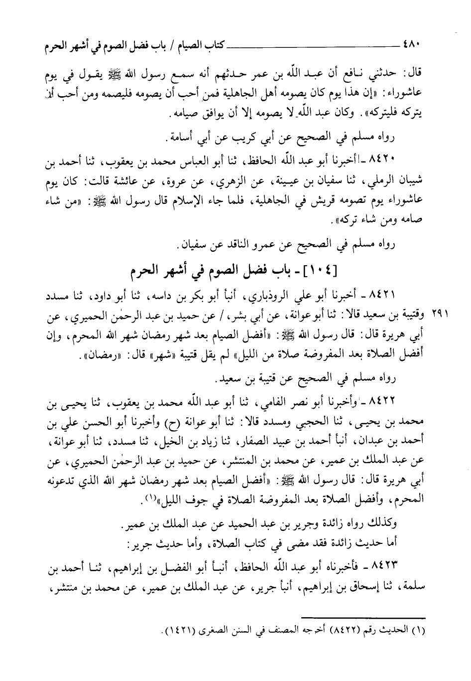 8422 - وَأَخْبَرَنَا أَبُو نَصْرٍ الْفَامِيُّ، ثنا أَبُو عَبْدِ اللهِ مُحَمَّدُ بْنُ يَعْقُوبَ , ثنا يَحْيَى بْنُ مُحَمَّدِ بْنِ يَحْيَى، ثنا الْحَجَبِيُّ، وَمُسَدَّدٌ قَالَا: ثنا أَبُو عَوَانَةَ، ح وَأَخْبَرَنَا أَبُو الْحَسَنِ عَلِيُّ بْنِ أَحْمَدَ بْنِ عَبْدَانَ , أنبأ أَحْمَدُ بْنُ عُبَيْدٍ الصَّفَّارُ، ثنا زِيَادُ بْنُ الْخَلِيلِ، ثنا مُسَدَّدٌ، ثنا أَبُو عَوَانَةَ، عَنْ عَبْدِ الْمَلِكِ بْنِ عُمَيْرٍ، عَنْ مُحَمَّدِ بْنِ الْمُنْتَشِرِ، عَنْ حُمَيْدِ بْنِ عَبْدِ الرَّحْمَنِ الْحِمْيَرِيِّ، عَنْ أَبِي هُرَيْرَةَ قَالَ: قَالَ رَسُولُ اللهِ صَلَّى اللهُ عَلَيْهِ وَسَلَّمَ: §" أَفْضَلُ الصِّيَامِ بَعْدَ شَهْرِ رَمَضَانَ شَهْرُ اللهِ الَّذِي تَدْعُونَهُ الْمُحَرَّمَ، وَأَفْضَلُ الصَّلَاةِ بَعْدَ الْمَفْرُوضَةِ الصَّلَاةُ فِي جَوْفِ اللَّيْلِ " وَكَذَلِكَ رَوَاهُ زَائِدَةُ وَجَرِيرُ بْنُ عَبْدِ الْحَمِيدِ عَنْ عَبْدِ الْمَلِكِ بْنِ عُمَيْرٍ أَمَّا حَدِيثُ زَائِدَةَ فَقَدْ مَضَى فِي كِتَابِ الصَّلَاةِ وَأَمَّا حَدِيثُ جَرِيرٍ