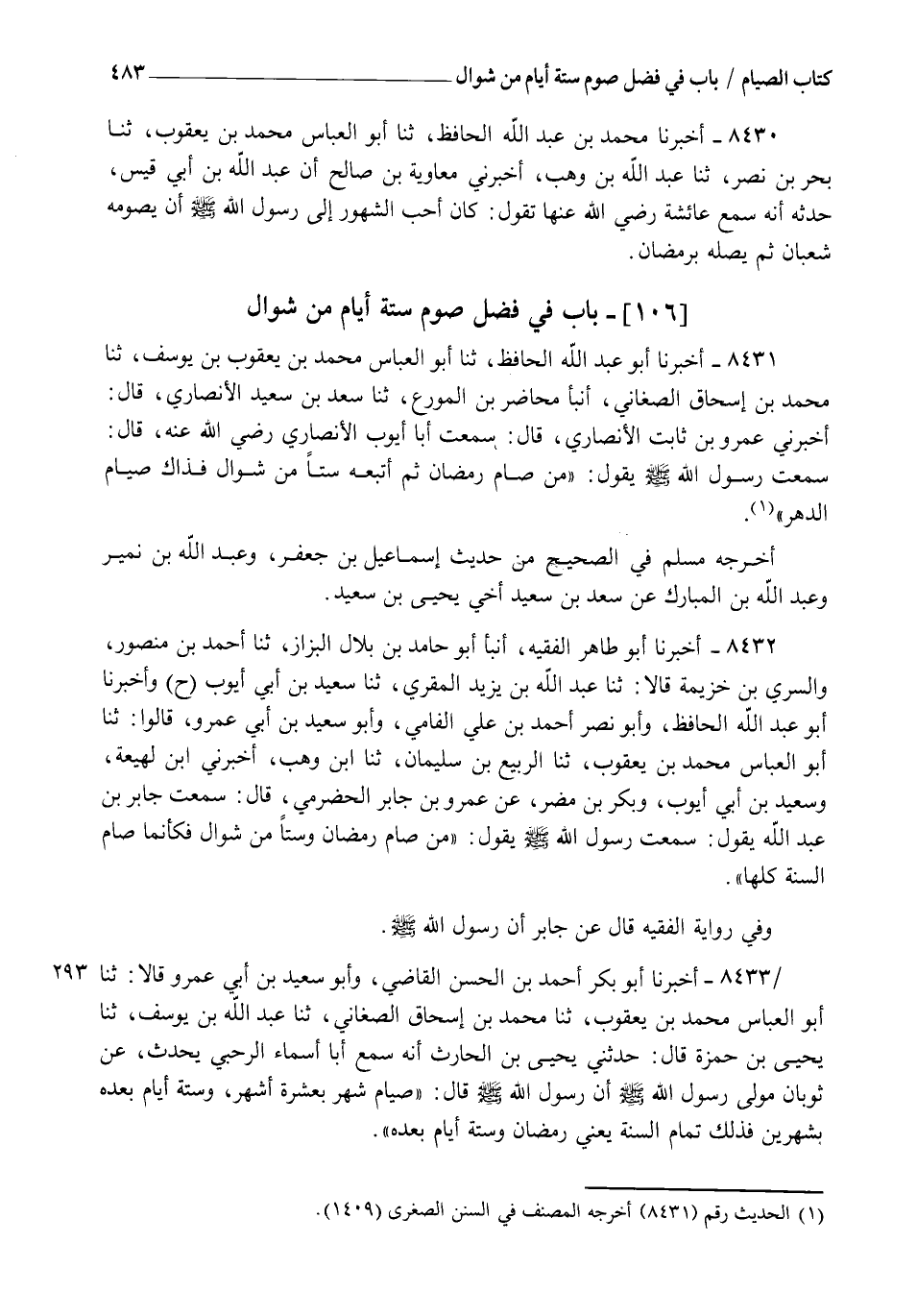 8431 - أَخْبَرَنَا أَبُو عَبْدِ اللهِ الْحَافِظُ، ثنا أَبُو الْعَبَّاسِ مُحَمَّدُ بْنُ يَعْقُوبَ بْنِ يُوسُفَ , ثنا مُحَمَّدُ بْنُ إِسْحَاقَ الصَّغَانِيُّ، أنبأ مُحَاضِرُ بْنُ الْمُوَرِّعِ، ثنا سَعْدُ بْنُ سَعِيدٍ الْأَنْصَارِيُّ، قَالَ: أَخْبَرَنِي عَمْرُو بْنُ ثَابِتٍ الْأَنْصَارِيُّ، قَالَ: سَمِعْتُ أَبَا أَيُّوبَ الْأَنْصَارِيَّ، رَضِيَ اللهُ عَنْهُ قَالَ: سَمِعْتُ رَسُولَ اللهِ صَلَّى اللهُ عَلَيْهِ وَسَلَّمَ يَقُولُ: §" مَنْ صَامَ رَمَضَانَ ثُمَّ أَتْبَعَهُ سِتًّا مِنْ شَوَّالٍ فَذَاكَ صِيَامُ الدَّهْرِ " أَخْرَجَهُ مُسْلِمٌ فِي الصَّحِيحِ مِنْ حَدِيثِ إِسْمَاعِيلَ بْنِ جَعْفَرٍ وَعَبْدِ اللهِ بْنِ نُمَيْرٍ وَعَبْدِ اللهِ بْنِ الْمُبَارَكِ عَنْ سَعْدِ بْنِ سَعِيدٍ أَخِي يَحْيَى بْنِ سَعِيدٍ