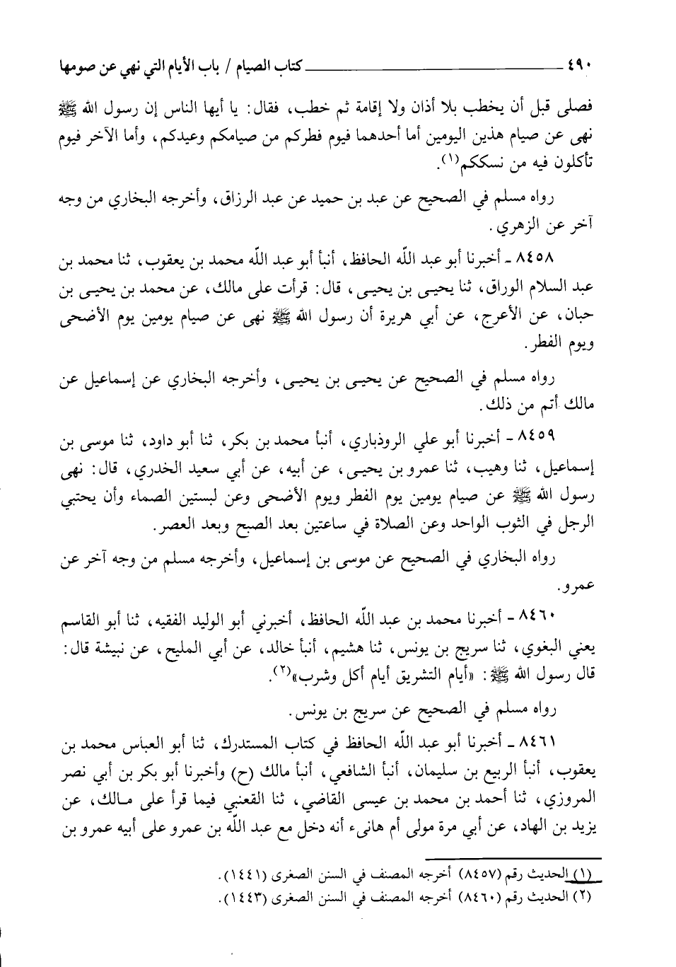 8458 - أَخْبَرَنَا أَبُو عَبْدِ اللهِ الْحَافِظُ، أنبأ أَبُو عَبْدِ اللهِ مُحَمَّدُ بْنُ يَعْقُوبَ , ثنا مُحَمَّدُ بْنُ عَبْدِ السَّلَامِ الْوَرَّاقُ، ثنا يَحْيَى بْنُ يَحْيَى قَالَ: قَرَأْتُ عَلَى مَالِكٍ عَنْ مُحَمَّدِ بْنِ يَحْيَى بْنِ حَبَّانَ، عَنِ الْأَعْرَجِ، عَنْ أَبِي هُرَيْرَةَ أَنَّ رَسُولَ اللهِ صَلَّى اللهُ عَلَيْهِ وَسَلَّمَ §نَهَى عَنْ صِيَامِ يَوْمَيْنِ يَوْمِ الْأَضْحَى وَيَوْمِ الْفِطْرِ. رَوَاهُ مُسْلِمٌ فِي الصَّحِيحِ عَنْ يَحْيَى بْنِ يَحْيَى وَأَخْرَجَهُ الْبُخَارِيُّ عَنْ إِسْمَاعِيلَ عَنْ مَالِكٍ أَتَمَّ مِنْ ذَلِكَ
