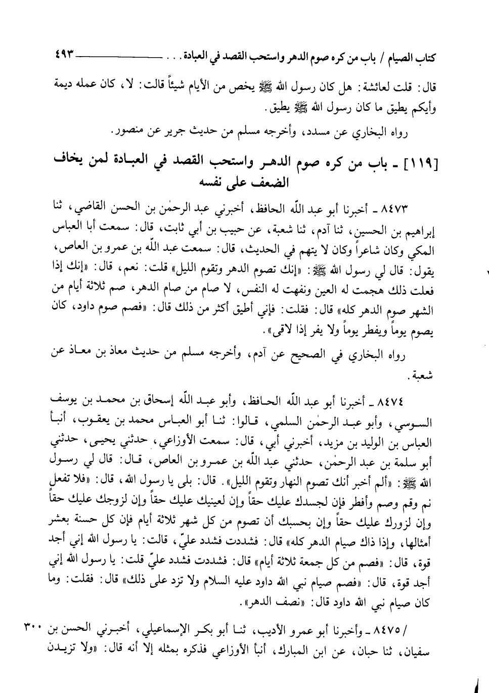 8474 - أَخْبَرَنَا أَبُو عَبْدِ اللهِ الْحَافِظُ، وَأَبُو عَبْدِ اللهِ إِسْحَاقُ بْنُ مُحَمَّدِ بْنِ يُوسُفَ السُّوسِيُّ وَأَبُو عَبْدِ الرَّحْمَنِ السُّلَمِيُّ , قَالُوا: ثنا أَبُو الْعَبَّاسِ مُحَمَّدُ بْنُ يَعْقُوبَ أنبأ الْعَبَّاسُ بْنُ الْوَلِيدِ بْنِ مَزْيَدَ، أَخْبَرَنِي أَبِي قَالَ: سَمِعْتُ الْأَوْزَاعِيَّ، حَدَّثَنِي يَحْيَى، حَدَّثَنِي أَبُو سَلَمَةَ بْنُ عَبْدِ الرَّحْمَنِ، حَدَّثَنِي عَبْدُ اللهِ بْنُ عَمْرِو بْنِ الْعَاصِ قَالَ: قَالَ لِي رَسُولُ اللهِ صَلَّى اللهُ عَلَيْهِ وَسَلَّمَ: " أَلَمْ أُخْبَرْ أَنَّكَّ تَصُومُ النَّهَارَ وَتَقُومُ اللَّيْلَ؟ " قَالَ: بَلَى يَا رَسُولَ اللهِ , قَالَ: " فَلَا تَفْعَلْ نَمْ وَقُمْ وَصُمْ وَأَفْطِرْ فَإِنَّ لِجَسَدِكَ عَلَيْكَ حَقًّا وَإِنَّ لِعَيْنَيْكَ عَلَيْكَ حَقًّا وَإِنَّ لِزَوْجِكَ عَلَيْكَ حَقًّا وَإِنَّ لِزَوْرِكَ عَلَيْكَ حَقًّا وَإِنَّ §بِحَسْبِكَ أَنْ تَصُومَ مِنْ كُلِّ شَهْرٍ ثَلَاثَةَ أَيَّامٍ فَإِنَّ كُلَّ حَسَنَةٍ بِعَشْرِ أَمْثَالِهَا وَإِذَا ذَاكَ صِيَامُ الدَّهْرِ كُلِّهِ " قَالَ: فَشَدَّدْتُ فَشُدِّدَ عَلَيَّ , قَالَ: يَا رَسُولَ اللهِ، إِنِّي أَجِدُ قُوَّةً قَالَ: " فَصُمْ مِنْ كُلِّ جُمُعَةٍ ثَلَاثَةَ أَيَّامٍ " قَالَ: فَشَدَّدْتُ فَشُدِّدَ عَلَيَّ قُلْتُ: يَا رَسُولَ اللهِ إِنِّي أَجِدُ قُوَّةً، قَالَ: " فَصُمْ صِيَامَ نَبِيِّ اللهِ دَاوُدَ عَلَيْهِ السَّلَامُ وَلَا تَزِدْ عَلَى ذَلِكَ " قَالَ: فَقُلْتُ وَمَا كَانَ صِيَامُ نَبِيِّ اللهِ دَاوُدَ؟ قَالَ: " نِصْفُ الدَّهْرِ "