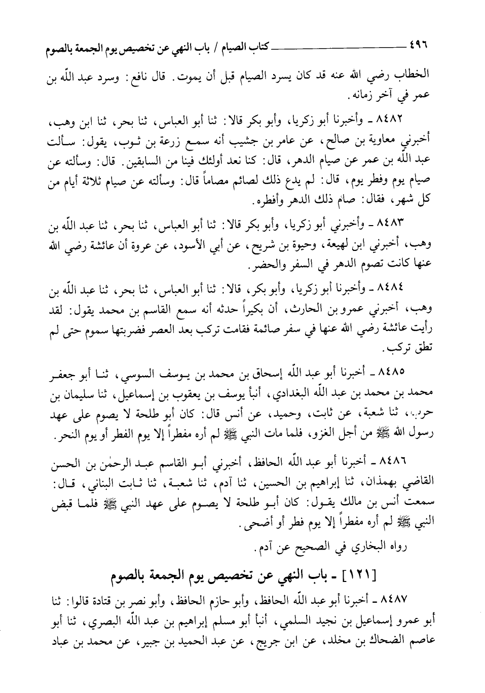 8487 - أَخْبَرَنَا أَبُو عَبْدِ اللهِ الْحَافِظُ، وَأَبُو حَازِمٍ الْحَافِظُ وَأَبُو نَصْرِ بْنُ قَتَادَةَ قَالُوا: ثنا أَبُو عَمْرٍو إِسْمَاعِيلُ بْنُ نُجَيْدٍ السُّلَمِيُّ , أنبأ أَبُو مُسْلِمٍ إِبْرَاهِيمُ بْنُ عَبْدِ اللهِ الْبَصْرِيُّ , ثنا أَبُو عَاصِمٍ الضَّحَّاكُ بْنُ مَخْلَدٍ، عَنِ ابْنِ جُرَيْجٍ، عَنْ عَبْدِ الْحَمِيدِ بْنِ جُبَيْرٍ، عَنْ مُحَمَّدِ بْنِ عَبَّادٍ، -[497]- قَالَ: قُلْتُ لِجَابِرِ بْنِ عَبْدِ اللهِ: هَلْ §نَهَى رَسُولُ اللهِ صَلَّى اللهُ عَلَيْهِ وَسَلَّمَ عَنْ صَوْمِ يَوْمِ الْجُمُعَةِ؟ قَالَ: أَيْ وَرَبِّ هَذَا الْبَيْتِ رَوَاهُ الْبُخَارِيُّ عَنْ أَبِي عَاصِمٍ وَأَخْرَجَهُ مُسْلِمٌ مِنْ حَدِيثِ عَبْدِ الرَّزَّاقِ عَنِ ابْنِ جُرَيْجِ قَالَ الْبُخَارِيُّ زَادَ غَيْرُ أَبِي عَاصِمٍ أَنْ يُفْرِدَ بِصَوْمٍ، قَالَ الشَّيْخُ: هَذِهِ الزِّيَادَةُ ذَكَرَهَا يَحْيَى بْنُ سَعِيدٍ الْقَطَّانُ عَنِ ابْنِ جُرَيْجٍ إِلَّا أَنَّهُ قَصَّرَ بِإِسْنَادِهِ فَلَمْ يَذْكُرْ فِيهِ عَبْدَ الْحَمِيدِ بْنَ جُبَيْرٍ وَقَدْ رَوَيْتُ هَذِهِ الزِّيَادَةَ فِي حَدِيثِ أَبِي هُرَيْرَةَ وَغَيْرِهِ