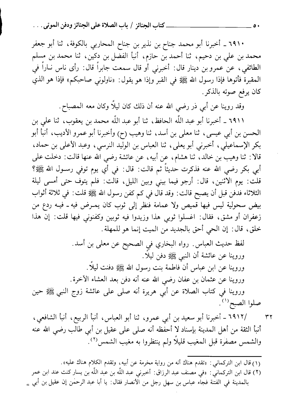 6911 - أَخْبَرَنَا أَبُو عَبْدِ اللهِ الْحَافِظُ، ثنا أَبُو عَبْدِ اللهِ مُحَمَّدُ بْنُ يَعْقُوبَ، ثنا عَلِيُّ بْنُ الْحَسَنِ بْنِ أَبِي عِيسَى، ثنا مُعَلَّى بْنُ أَسَدٍ، ثنا وُهَيْبٌ، ح وَأَخْبَرَنَا أَبُو عَمْرٍو الْأَدِيبُ، أنبأ أَبُو بَكْرٍ الْإِسْمَاعِيلِيُّ، أَخْبَرَنِي أَبُو يَعْلَى، ثنا الْعَبَّاسُ بْنُ الْوَلِيدِ النَّرْسِيُّ، وَعَبْدُ الْأَعْلَى بْنُ حَمَّادٍ، قَالَا: ثنا وُهَيْبُ بْنُ خَالِدٍ، ثنا هِشَامٌ، عَنْ أَبِيهِ، عَنْ عَائِشَةَ، رَضِيَ اللهُ عَنْهَا قَالَتْ: " دَخَلْتُ عَلَى أَبِي بَكْرٍ رَضِيَ اللهُ عَنْهُ فَذَكَرَتْ حَدِيثًا "، ثُمَّ قَالَتْ: قَالَ: فِي §أِيِّ يَوْمٍ تُوُفِّيَ رَسُولُ اللهِ صَلَّى الله عَلَيهِ وَسَلَّمَ؟ قُلْتُ " يَوْمَ الِاثْنَيْنِ " قَالَ: أَرْجُو فِيمَا بَيْنِي وَبَيْنَ اللَّيْلِ قَالَتْ: " فَلَمْ يُتَوَفَّ حَتَّى أَمْسَى لَيْلَةَ الثُّلَاثَاءِ، فَدُفِنَ قَبْلَ أَنْ يُصْبِحَ " قَالَتْ: وَقَدْ قَالَ: فِي كَمْ كُفِّنَ رَسُولُ اللهِ صَلَّى الله عَلَيهِ وَسَلَّمَ؟ قُلْتُ: " فِي ثَلَاثَةِ أَثْوَابٍ بِيضٍ سُحُولِيَّةٍ لَيْسَ فِيهَا قَمِيصٌ وَلَا عِمَامَةٌ "، فَنَظَرَ إِلَى ثَوْبٍ كَانَ يُمَرَّضُ فِيهِ، فِيهِ رَدْعٌ مِنْ زَعْفَرَانٍ أَوْ مِشْقٍ، فَقَالَ: اغْسِلُوا ثَوْبِي هَذَا وَزِيدُوا فِيهِ ثَوْبَيْنِ وَكَفِّنُونِي فِيهَا، قُلْتُ " إِنَّ هَذَا خَلَقٌ " قَالَ: " إِنَّ الْحِيَّ أَحَقُّ بِالْجَدِيدِ مِنَ الْمَيِّتِ، إِنَّمَا هُوَ لِلْمُهْلَةِ " لَفْظُ حَدِيثِ الْعَبَّاسِ، رَوَاهُ الْبُخَارِيُّ فِي الصَّحِيحِ عَنْ مُعَلَّى بْنِ أَسَدٍ، وَرُوِّينَا عَنْ عَائِشَةَ أَنَّ النَّبِيَّ صَلَّى الله عَلَيهِ وَسَلَّمَ دُفِنَ لَيْلًا، وَرُوِّينَا عَنِ ابْنِ عَبَّاسٍ أَنَّ فَاطِمَةَ بِنْتَ رَسُولِ اللهِ صَلَّى الله عَلَيهِ وَسَلَّمَ دُفِنَتْ لَيْلًا، وَرُوِّينَا عَنْ عُثْمَانَ بْنِ عَفَّانَ رَضِيَ اللهُ عَنْهُ أَنَّهُ دُفِنَ بَعْدَ الْعِشَاءِ الْآخِرَةِ، وَرُوِّينَا فِي كِتَابِ الصَّلَاةِ عَنْ أَبِي هُرَيْرَةَ أَنَّهُ صَلَّى عَلَى عَائِشَةَ زَوْجِ النَّبِيِّ صَلَّى الله عَلَيهِ وَسَلَّمَ حِينَ صَلَّوُا الصُّبْحَ