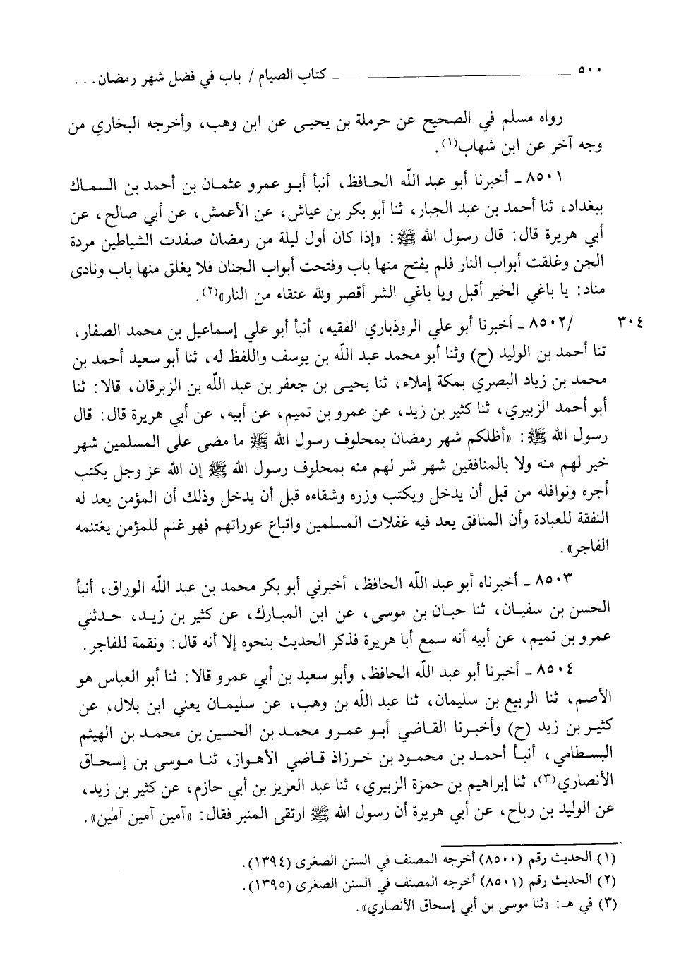 8502 - أَخْبَرَنَا أَبُو عَلِيٍّ الرُّوذْبَارِيُّ الْفَقِيهُ، أنبأ أَبُو عَلِيٍّ إِسْمَاعِيلُ بْنُ مُحَمَّدٍ الصَّفَّارُ , ثنا أَحْمَدُ بْنُ الْوَلِيدِ، ح وَثنا أَبُو مُحَمَّدٍ عَبْدُ اللهِ بْنُ يُوسُفَ، وَاللَّفْظُ لَهُ ثنا أَبُو سَعِيدٍ أَحْمَدُ بْنُ مُحَمَّدِ بْنِ زِيَادٍ الْبَصْرِيُّ بِمَكَّةَ إِمْلَاءً , ثنا يَحْيَى بْنُ جَعْفَرِ بْنِ عَبْدِ اللهِ بْنِ الزِّبْرِقَانِ قَالَا: ثنا أَبُو أَحْمَدَ الزُّبَيْرِيُّ، ثنا كَثِيرُ بْنُ زَيْدٍ، عَنْ عَمْرِو بْنِ تَمِيمٍ، عَنْ أَبِيهِ، عَنْ أَبِي هُرَيْرَةَ قَالَ: قَالَ رَسُولُ اللهِ صَلَّى اللهُ عَلَيْهِ وَسَلَّمَ: §" أَظَلَّكُمْ شَهْرُ رَمَضَانَ بِمَحْلُوفِ رَسُولِ اللهِ صَلَّى اللهُ عَلَيْهِ وَسَلَّمَ مَا مَضَى عَلَى الْمُسْلِمِينَ شَهْرٌ خَيْرٌ لَهُمْ مِنْهُ وَلَا بِالْمُنَافِقِينَ شَهْرٌ شَرٌّ لَهُمْ مِنْهُ بِمَحْلُوفِ رَسُولِ اللهِ صَلَّى اللهُ عَلَيْهِ وَسَلَّمَ إِنَّ اللهَ عَزَّ وَجَلَّ يَكْتُبُ أَجْرَهُ وَنَوَافِلَهُ مِنْ قَبْلِ أَنْ يَدْخُلَ وَيَكْتُبَ وِزْرَهُ وَشَقَاءَهُ قَبْلَ أَنْ يَدْخُلَ وَذَلِكَ أَنَّ الْمُؤْمِنَ يَعُدُّ لَهُ النَّفَقَةَ لِلْعِبَادَةِ وَأَنَّ الْمُنَافِقَ يَعُدُّ فِيهِ غَفَلَاتِ الْمُسْلِمِينَ وَاتِّبَاعَ عَوْرَاتِهِمْ فَهُوَ غَنْمٌ لِلْمُؤْمِنِ يغْتَنِمُهُ الْفَاجِرُ "