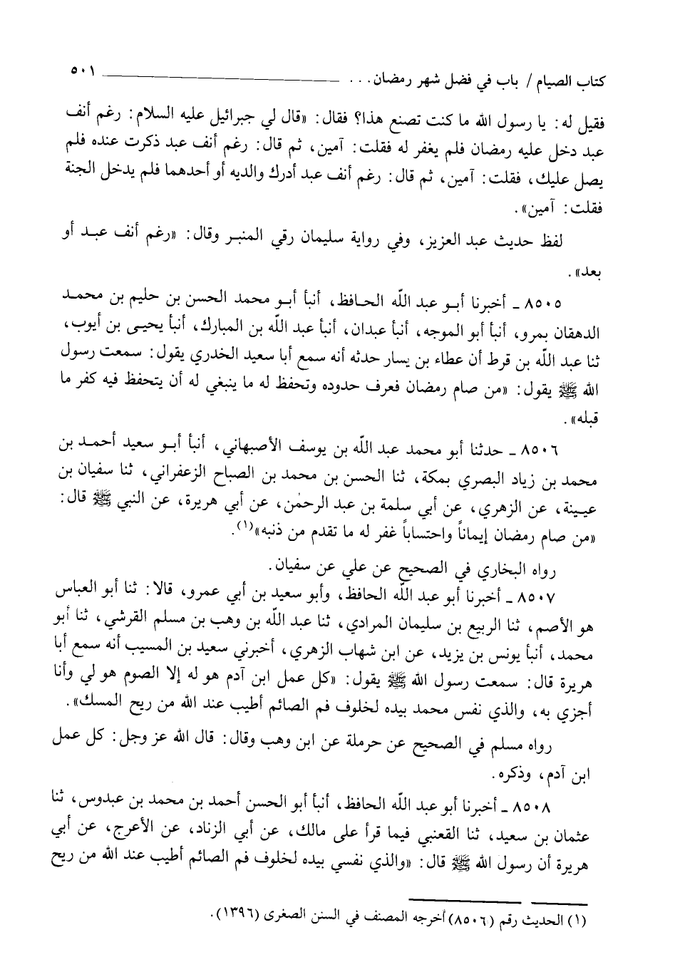 8506 - حَدَّثَنَا أَبُو مُحَمَّدٍ عَبْدُ اللهِ بْنُ يُوسُفَ الْأَصْبَهَانِيُّ، أنبأ أَبُو سَعِيدٍ أَحْمَدُ بْنُ مُحَمَّدِ بْنِ زِيَادٍ الْبَصْرِيُّ بِمَكَّةَ , ثنا الْحَسَنُ بْنُ مُحَمَّدِ بْنِ الصَّبَّاحِ الزَّعْفَرَانِيُّ، ثنا سُفْيَانُ بْنُ عُيَيْنَةَ، عَنِ الزُّهْرِيِّ، عَنْ أَبِي سَلَمَةَ بْنِ عَبْدِ الرَّحْمَنِ، عَنْ أَبِي هُرَيْرَةَ، عَنِ النَّبِيِّ صَلَّى اللهُ عَلَيْهِ وَسَلَّمَ قَالَ: §" مَنْ صَامَ رَمَضَانَ إِيمَانًا وَاحْتِسَابًا غُفِرَ لَهُ مَا تَقَدَّمَ مِنْ ذَنْبِهِ " رَوَاهُ الْبُخَارِيُّ فِي الصَّحِيحِ عَنْ عَلِيٍّ عَنْ سُفْيَانَ