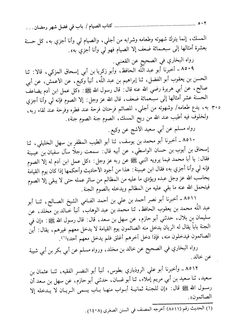 8512 - وَأَخْبَرَنَا أَبُو عَلِيٍّ الرُّوذْبَارِيُّ، بِطُوسٍ أنبأ أَبُو النَّضْرِ الْفَقِيهُ، ثنا عُثْمَانُ بْنُ سَعِيدٍ، ثنا سَعِيدُ بْنُ أَبِي مَرْيَمَ إِمْلَاءً , ثنا أَبُو غَسَّانَ، حَدَّثَنِي أَبُو حَازِمٍ، عَنْ سَهْلِ بْنِ سَعْدٍ أَنَّ رَسُولَ اللهِ صَلَّى اللهُ عَلَيْهِ وَسَلَّمَ قَالَ: " إِنَّ §لِلْجَنَّةِ ثَمَانِيَةَ أَبْوَابٍ مِنْهَا بَابٌ يُسَمَّى الرَّيَّانُ لَا يَدْخُلُهُ إِلَّا الصَّائِمُونَ ". -[503]- رَوَاهُ الْبُخَارِيُّ فِي الصَّحِيحِ عَنْ سَعِيدِ بْنِ أَبِي مَرْيَمَ