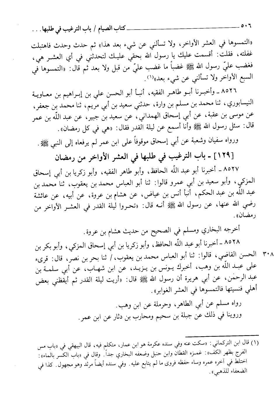 8526 - وَأَخْبَرَنَا أَبُو طَاهِرٍ الْفَقِيهُ، أنبأ أَبُو الْحَسَنِ عَلِيُّ بْنُ إِبْرَاهِيمَ بْنِ مُعَاوِيَةَ النَّيْسَابُورِيُّ , ثنا مُحَمَّدُ بْنُ مُسْلِمِ بْنِ وَارَةَ، حَدَّثَنِي سَعِيدُ بْنُ أَبِي مَرْيَمَ، ثنا مُحَمَّدُ بْنُ جَعْفَرٍ، عَنْ مُوسَى بْنِ عُقْبَةَ، عَنْ أَبِي إِسْحَاقَ الْهَمْدَانِيِّ، عَنْ سَعِيدِ بْنِ جُبَيْرٍ، عَنْ عَبْدِ اللهِ بْنِ عُمَرَ، قَالَ: سُئِلَ رَسُولُ اللهِ صَلَّى اللهُ عَلَيْهِ وَسَلَّمَ وَأَنَا أَسْمَعُ عَنْ لَيْلَةِ الْقَدْرِ , فَقَالَ §" هِيَ فِي كُلِّ رَمَضَانَ " وَرَوَاهُ سُفْيَانُ وَشُعْبَةُ عَنْ أَبِي إِسْحَاقَ مَوْقُوفًا عَلَى ابْنِ عُمَرَ لَمْ يَرْفَعَاهُ إِلَى النَّبِيِّ صَلَّى اللهُ عَلَيْهِ وَسَلَّمَ