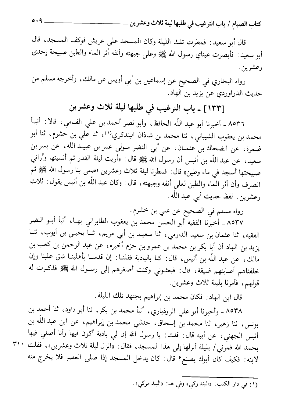 8537 - أَخْبَرَنَا الْفَقِيهُ أَبُو الْحَسَنِ مُحَمَّدُ بْنُ يَعْقُوبَ الطَّبَرَانِيُّ بِهَا أنبأ أَبُو النَّضْرٍ الْفَقِيهُ، ثنا عُثْمَانُ بْنُ سَعِيدٍ الدَّارِمِيُّ، ثنا سَعِيدُ بْنُ أَبِي مَرْيَمَ، ثنا يَحْيَى بْنُ أَيُّوبَ، ثنا يَزِيدُ بْنُ الْهَادِ، أَنَّ أَبَا بَكْرِ بْنَ مُحَمَّدِ بْنِ عَمْرِو بْنِ حَزْمٍ، أَخْبَرَهُ عَنْ عَبْدِ الرَّحْمَنِ بْنِ كَعْبِ بْنِ مَالِكٍ، عَنْ عَبْدِ اللهِ بْنِ أُنَيْسٍ، قَالَ: كُنَّا بِالْبَادِيَةِ فَقُلْنَا إِنْ قَدِمْنَا بِأَهْلِينَا شَقَّ عَلَيْنَا وَإِنْ خَلَّفْنَاهُمْ أَصَابَتْهُمْ ضِيقَةٌ، قَالَ: فَبَعَثُونِي وَكُنْتُ أَصْغَرَهُمْ إِلَى رَسُولِ اللهِ صَلَّى اللهُ عَلَيْهِ وَسَلَّمَ فَذَكَرْتُ لَهُ قَوْلَهُمْ §فَأَمَرَنَا بِلَيْلَةِ ثَلَاثٍ وَعِشْرِينَ. قَالَ ابْنُ الْهَادِ: فَكَانَ مُحَمَّدُ بْنُ إِبْرَاهِيمَ يَجْتَهِدُ تِلْكَ اللَّيْلَةَ