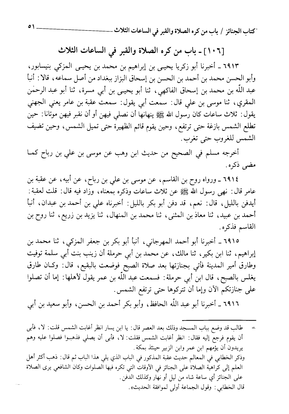6913 - أَخْبَرَنَا أَبُو زَكَرِيَّا يَحْيَى بْنُ إِبْرَاهِيمَ بْنِ مُحَمَّدِ بْنِ يَحْيَى الْمُزَكِّي بِنَيْسَابُورَ، وَأَبُو الْحَسَنِ مُحَمَّدُ بْنُ أَحْمَدَ بْنِ الْحَسَنِ بْنِ إِسْحَاقَ الْبَزَّازُ بِبَغْدَادَ مِنْ أَصْلِ سَمَاعِهِ، قَالَا: أنبأ عَبْدُ اللهِ بْنُ مُحَمَّدِ بْنِ إِسْحَاقَ الْفَاكِهِيُّ، ثنا أَبُو يَحْيَى بْنُ أَبِي مَسَرَّةَ، ثنا أَبُو عَبْدِ الرَّحْمَنِ الْمُقْرِئُ، ثنا مُوسَى بْنُ عَلِيٍّ، قَالَ: سَمِعْتُ أَبِي يَقُولُ: سَمِعْتُ عُقْبَةَ بْنَ عَامِرٍ يَعْنِي الْجُهَنِيَّ يَقُولُ: " ثَلَاثَ سَاعَاتٍ كَانَ رَسُولُ اللهِ صَلَّى الله عَلَيهِ وَسَلَّمَ §يَنْهَانَهَا أَنْ نُصَلِّيَ فِيهِنَّ أَوْ أَنْ نَقْبُرَ فِيهِنَّ مَوْتَانَا حِينَ تَطْلُعُ الشَّمْسُ بَازِغَةً حَتَّى تَرْتَفِعَ، وَحِينَ يَقُومُ قَائِمُ الظَّهِيرَةِ حَتَّى تَمِيلَ الشَّمْسُ، وَحِينَ تَضَيَّفُ الشَّمْسُ لِلْغُرُوبِ حَتَّى تَغْرُبَ " أَخْرَجَهُ مُسْلِمٌ فِي الصَّحِيحِ مِنْ حَدِيثِ ابْنِ وَهْبٍ، عَنْ مُوسَى بْنِ عَلِيِّ بْنِ رَبَاحٍ كَمَا مَضَى ذِكْرُهُ