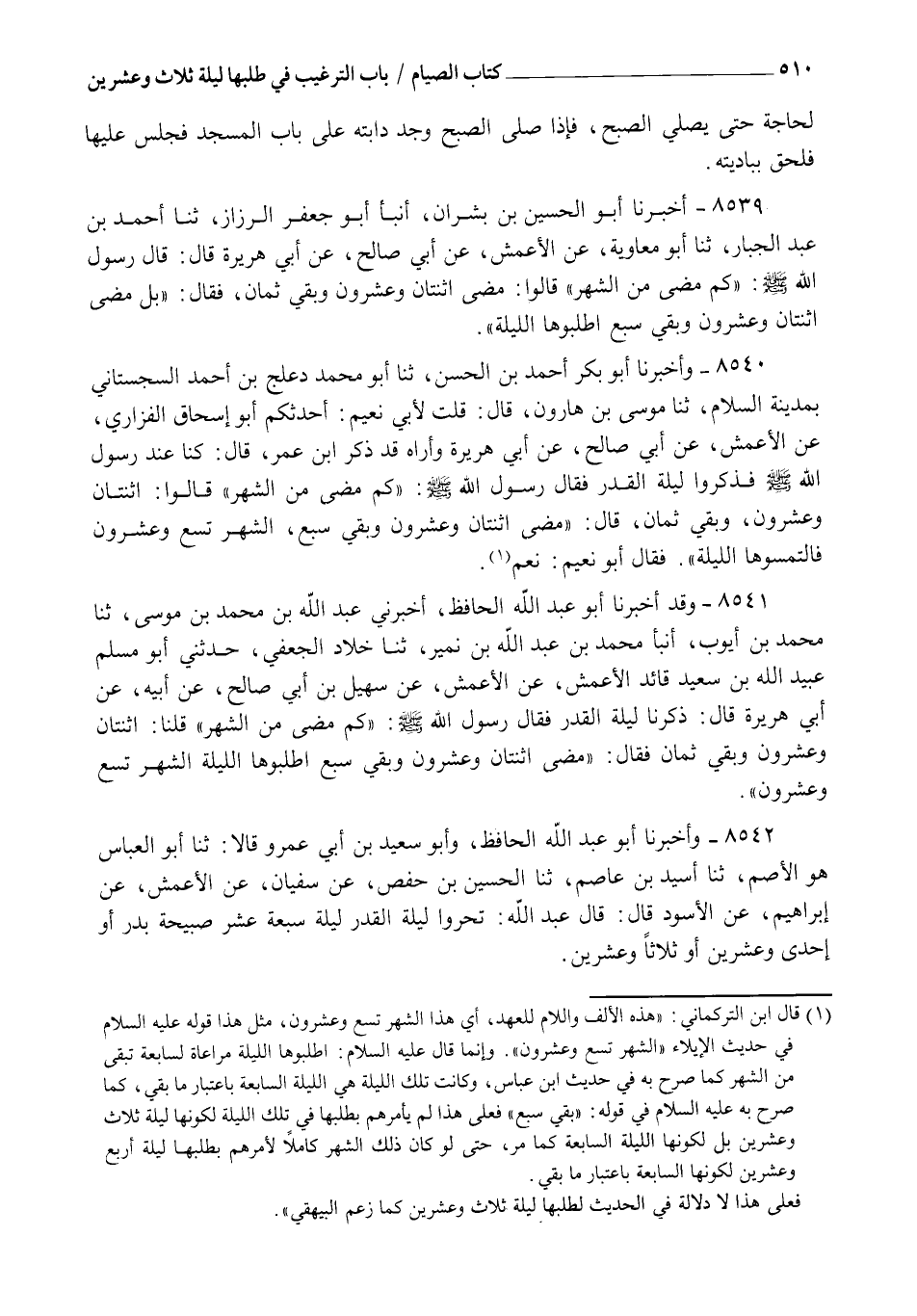 8541 - وَقَدْ أَخْبَرَنَا أَبُو عَبْدِ اللهِ الْحَافِظُ، أَخْبَرَنِي عَبْدُ اللهِ بْنُ مُحَمَّدِ بْنِ مُوسَى، ثنا مُحَمَّدُ بْنُ أَيُّوبَ، أنبأ مُحَمَّدُ بْنُ عَبْدِ اللهِ بْنِ نُمَيْرٍ، ثنا خَلَّادٌ الْجُعْفِيُّ، حَدَّثَنِي أَبُو مُسْلِمٍ عُبَيْدُ اللهِ بْنُ سَعِيدٍ قَائِدُ الْأَعْمَشِ عَنِ الْأَعْمَشِ، عَنْ سُهَيْلِ بْنِ أَبِي صَالِحٍ، عَنْ أَبِيهِ، عَنْ أَبِي هُرَيْرَةَ، قَالَ: ذَكَرْنَا لَيْلَةَ الْقَدْرِ فَقَالَ رَسُولُ اللهِ صَلَّى اللهُ عَلَيْهِ وَسَلَّمَ §" كَمْ مَضَى مِنَ الشَّهْرِ؟ " قُلْنَا اثْنَتَانِ وَعِشْرُونَ وَبَقِيَ ثَمَانٍ فَقَالَ: " مَضَى اثْنَتَانِ وَعِشْرُونَ وَبَقِيَ سَبْعٌ اطْلُبُوهَا اللَّيْلَةَ الشَّهْرُ تِسْعٌ وَعِشْرُونَ "