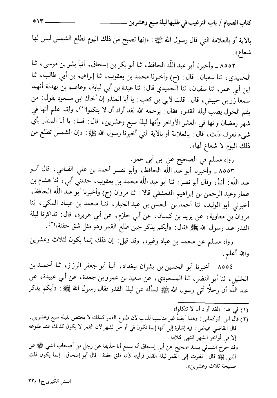 8552 - وَأَخْبَرَنَا أَبُو عَبْدِ اللهِ الْحَافِظُ، ثنا أَبُو بَكْرِ بْنُ إِسْحَاقَ، أنبأ بِشْرُ بْنُ مُوسَى، ثنا الْحُمَيْدِيُّ، ثنا سُفْيَانُ، قَالَ، ح وَأَخْبَرَنَا مُحَمَّدُ بْنُ يَعْقُوبَ، ثنا إِبْرَاهِيمُ بْنُ أَبِي طَالِبٍ، ثنا ابْنُ أَبِي عُمَرَ، ثنا سُفْيَانُ ـ قَالَ الْحُمَيْدِيُّ ـ قَالَ: ثنا عَبْدَةُ بْنُ أَبِي لُبَابَةَ، وَعَاصِمُ ابْنُ بَهْدَلَةَ، أَنَّهُمَا سَمِعَا زِرَّ بْنَ حُبَيْشٍ، قَالَ: قُلْتُ لِأُبَيِّ بْنِ كَعْبٍ يَا أَبَا الْمُنْذِرِ إِنَّ أَخَاكَ ابْنَ مَسْعُودٍ يَقُولُ: مَنْ يَقُمِ الْحَوْلَ يُصِبْ لَيْلَةَ الْقَدْرِ، فَقَالَ: يَرْحَمُهُ اللهُ لَقَدْ أَرَادَ أَنْ لَا يَتَّكِلُوا وَلَقَدْ عَلِمَ أَنَّهَا فِي شَهْرِ رَمَضَانَ وَأَنَّهَا فِي الْعَشْرِ الْأَوَاخِرِ وَأَنَّهَا لَيْلَةُ سَبْعٍ وَعِشْرِينَ , قَالَ: قُلْنَا: يَا أَبَا الْمُنْذِرِ بِأِيِّ شَيْءٍ تَعْرِفُ ذَلِكَ قَالَ: بِالْعَلَامَةِ أَوْ بِالْآيَةِ الَّتِي أَخْبَرَنَا رَسُولُ اللهِ صَلَّى اللهُ عَلَيْهِ وَسَلَّمَ " إِنَّ §الشَّمْسَ تَطْلُعُ مِنْ ذَلِكَ الْيَوْمِ لَا شُعَاعَ لَهَا ". رَوَاهُ مُسْلِمٌ فِي الصَّحِيحِ عَنِ ابْنِ أَبِي عُمَرَ