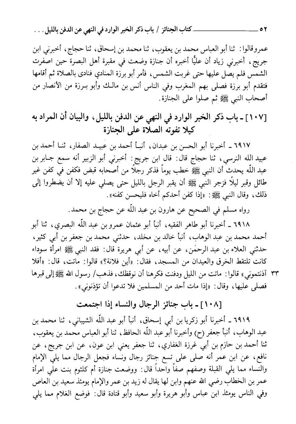 6919 - أَخْبَرَنَا أَبُو زَكَرِيَّا بْنُ أَبِي إِسْحَاقَ، أنبأ أَبُو عَبْدِ اللهِ الشَّيْبَانِيُّ، ثنا مُحَمَّدُ بْنُ عَبْدِ الْوَهَّابِ، أنبأ جَعْفَرٌ، ح وَأَخْبَرَنَا أَبُو عَبْدِ اللهِ الْحَافِظُ، ثنا أَبُو الْعَبَّاسِ مُحَمَّدُ بْنُ يَعْقُوبَ، ثنا أَحْمَدُ بْنُ حَازِمِ بْنِ أَبِي غَرَزَةَ الْغِفَارِيُّ، ثنا جَعْفَرٌ يَعْنِي ابْنَ عَوْنٍ، عَنِ ابْنِ جُرَيْجٍ، عَنْ نَافِعٍ، عَنِ ابْنِ عُمَرَ: أَنَّهُ §صَلَّى عَلَى تِسْعِ جَنَائِزَ رِجَالٍ وَنِسَاءٍ فَجَعَلَ الرِّجَالَ مِمَّا يَلِي الْإِمَامَ وَالنِّسَاءَ مِمَّا يَلِي الْقِبْلَةَ، وَصَفَّهُمْ صَفًّا وَاحِدًا قَالَ: " وَوُضِعَتْ جِنَازَةُ أُمِّ كُلْثُومِ بِنْتِ عَلِيٍّ امْرَأَةِ عُمَرَ بْنِ الْخَطَّابِ رَضِيَ اللهُ عَنْهُمْ وَابْنٍ لَهَا يُقَالُ لَهُ: زَيْدُ بْنُ عُمَرَ وَالْإِمَامُ يَوْمَئِذٍ سَعِيدُ بْنُ الْعَاصِ وَفِي النَّاسِ يَوْمَئِذٍ ابْنُ عَبَّاسٍ، وَأَبُو هُرَيْرَةَ، وَأَبُو سَعِيدٍ، وَأَبُو قَتَادَةَ " , قَالَ: " فَوُضِعَ الْغُلَامُ مِمَّا يَلِي -[53]- الْإِمَامَ "، قَالَ رَجُلٌ: فَأَنْكَرْتُ ذَلِكَ، فَنَظَرْتُ إِلَى ابْنِ عَبَّاسٍ، وَأَبِي هُرَيْرَةَ، وَأَبِي سَعِيدٍ، وَأَبِي قَتَادَةَ رَضِيَ اللهُ عَنْهُمْ، فَقُلْتُ: مَا هَذَا؟ قَالُوا: السُّنَّةُ، لَفْظُ حَدِيثِ أَبِي عَبْدِ اللهِ، وَفِي رِوَايَةِ أَبِي زَكَرِيَّا أَنَّ ابْنَ عُمَرَ صَلَّى عَلَى تِسْعِ جَنَائِزَ جَمِيعًا وَقَالَ: فِي أُمِّ كُلْثُومٍ وَابْنِهَا فَوُضِعَا جَمِيعًا، وَالْبَاقِي سَوَاءٌ