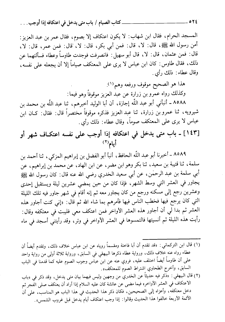 8588 - أَنْبَأَنِي أَبُو عَبْدِ اللهِ، إِجَازَةً , أَنَّ أَبَا الْوَلِيدِ أَخْبَرَهُمْ , ثنا عَبْدُ اللهِ بْنُ مُحَمَّدِ بْنِ شِيرَوَيْهِ، ثنا عَمْرُو بْنُ زُرَارَةَ، ثنا عَبْدُ الْعَزِيزِ، فَذَكَرَهُ مَوْقُوفًا مُخْتَصَرًا , قَالَ: فَقَالَ: كَانَ ابْنُ عَبَّاسٍ §لَا يَرَى عَلَى الْمُعْتَكِفِ صَوْمًا. وَقَالَ عَطَاءٌ: ذَلِكَ رَأْيٌ