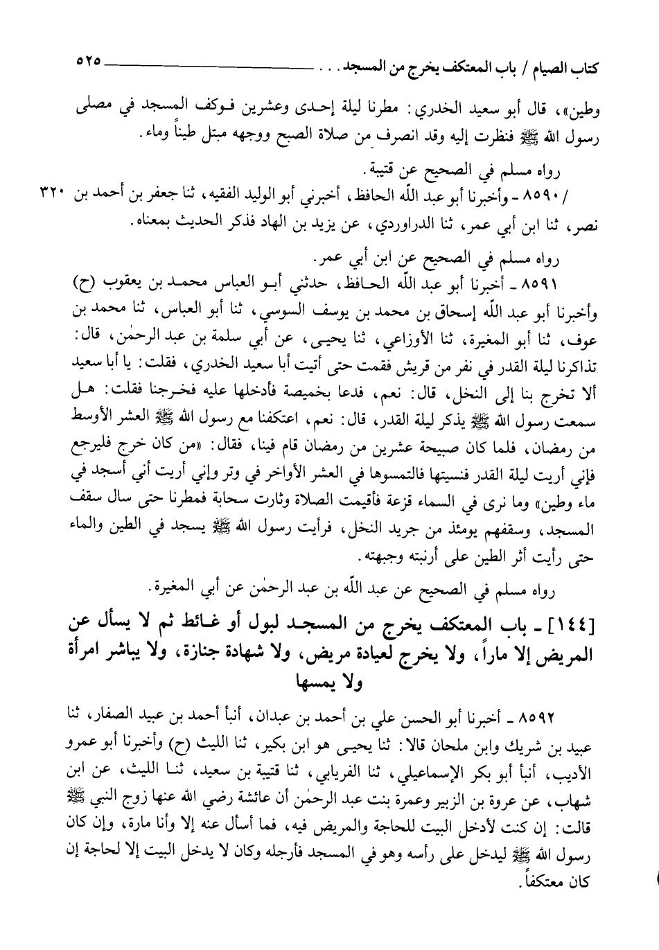 8591 - أَخْبَرَنَا أَبُو عَبْدِ اللهِ الْحَافِظُ، حَدَّثَنِي أَبُو الْعَبَّاسِ مُحَمَّدُ بْنُ يَعْقُوبَ ح وَأَخْبَرَنَا أَبُو عَبْدِ اللهِ إِسْحَاقُ بْنُ مُحَمَّدِ بْنِ يُوسُفَ السُّوسِيُّ , ثنا أَبُو الْعَبَّاسِ، ثنا مُحَمَّدُ بْنُ عَوْفٍ، ثنا أَبُو الْمُغِيرَةِ، ثنا الْأَوْزَاعِيُّ، ثنا يَحْيَى، عَنْ أَبِي سَلَمَةَ بْنِ عَبْدِ الرَّحْمَنِ، قَالَ: تَذَاكَرْنَا لَيْلَةَ الْقَدْرِ فِي نَفَرٍ مِنْ قُرَيْشٍ فَقُمْتُ حَتَّى أَتَيْتُ أَبَا سَعِيدٍ الْخُدْرِيَّ , فَقُلْتُ: يَا أَبَا سَعِيدٍ أَلَا تَخْرُجُ بِنَا إِلَى النَّخْلِ؟ قَالَ: نَعَمْ فَدَعَا بِخَمِيصَةٍ فَأَدْخَلَهَا عَلَيْهِ فَخَرَجْنَا فَقُلْتُ: هَلْ سَمِعْتَ رَسُولَ اللهِ صَلَّى اللهُ عَلَيْهِ وَسَلَّمَ يَذْكُرُ لَيْلَةَ الْقَدْرِ؟ قَالَ: نَعَمْ، اعْتَكَفْنَا مَعَ رَسُولِ اللهِ صَلَّى اللهُ عَلَيْهِ وَسَلَّمَ الْعَشْرَ الْأَوْسَطَ مِنْ رَمَضَانَ فَلَمَّا كَانَ صَبِيحَةُ عِشْرِينَ مِنْ رَمَضَانَ قَامَ فِينَا , فَقَالَ: §" مَنْ كَانَ خَرَجَ فَلْيَرْجِعْ فَإِنِّي أُرِيتُ لَيْلَةَ الْقَدْرِ فَنَسِيتُهَا فَالْتَمِسُوهَا فِي الْعَشْرِ الْأَوَاخِرِ فِي وِتْرٍ وَإِنِّي أُرِيتُ أَنِّي أَسْجُدُ فِي مَاءٍ وَطِينٍ ". وَمَا نَرَى فِي السَّمَاءِ قَزَعَةً فَأُقِيمَتِ الصَّلَاةُ وَثَارَتْ سَحَابَةٌ فَمُطِرْنَا حَتَّى سَالَ سَقْفُ الْمَسْجِدِ , وَسَقْفُهُمْ يَوْمَئِذٍ مِنْ جَرِيدِ النَّخْلِ فَرَأَيْتُ رَسُولَ اللهِ صَلَّى اللهُ عَلَيْهِ وَسَلَّمَ يَسْجُدُ فِي الطِّينِ وَالْمَاءِ حَتَّى رَأَيْتُ أَثَرَ الطِّينِ عَلَى أَرْنَبَتِهِ وَجَبْهَتِهِ. رَوَاهُ مُسْلِمٌ فِي الصَّحِيحِ عَنْ عَبْدِ اللهِ بْنِ عَبْدِ الرَّحْمَنِ عَنْ أَبِي الْمُغِيرَةِ