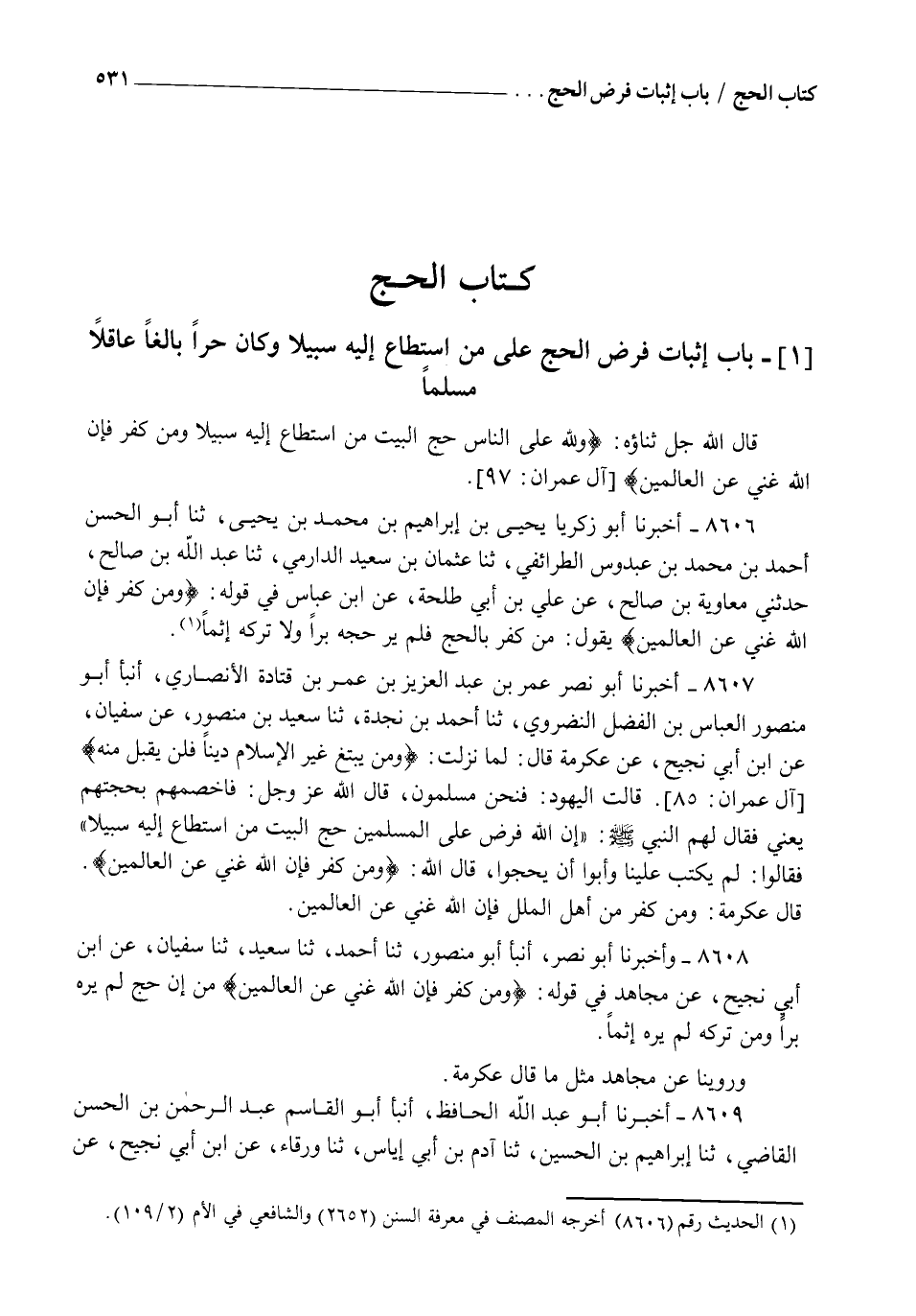 8608 - وَأَخْبَرَنَا أَبُو نَصْرٍ، أنبأ أَبُو مَنْصُورٍ، ثنا أَحْمَدُ، ثنا سَعِيدٌ، ثنا سُفْيَانُ، عَنِ ابْنِ أَبِي نَجِيحٍ، عَنْ مُجَاهِدٍ فِي قَوْلِهِ {وَمَنْ كَفَرَ فَإِنَّ اللهَ غَنِيٌّ عَنِ الْعَالَمِينَ} [آل عمران: 97] أَنَّ §مَنْ حَجَّ لَمْ يَرَهُ بِرًّا وَمَنْ تَرَكَهُ لَمْ يَرَهُ إِثْمًا. وَرُوِّينَا عَنْ مُجَاهِدٍ مِثْلَ مَا قَالَ عِكْرِمَةُ