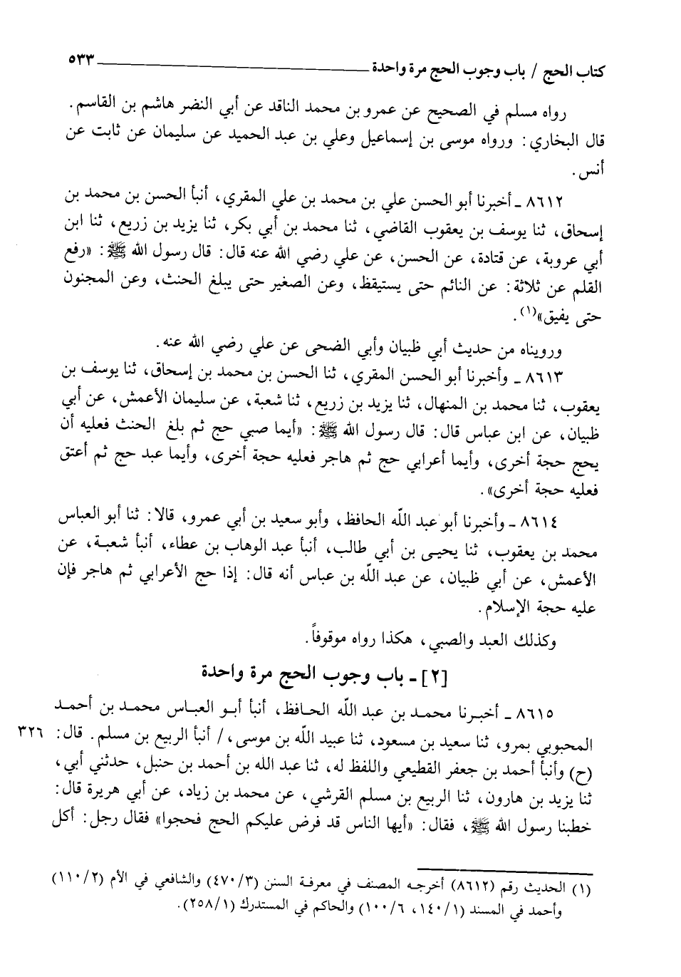 8613 - وَأَخْبَرَنَا أَبُو الْحَسَنِ الْمُقْرِئُ، ثنا الْحَسَنُ بْنُ مُحَمَّدِ بْنِ إِسْحَاقَ، ثنا يُوسُفُ بْنُ يَعْقُوبَ، ثنا مُحَمَّدُ بْنُ الْمِنْهَالِ، ثنا يَزِيدُ بْنُ زُرَيْعٍ، ثنا شُعْبَةُ، عَنْ سُلَيْمَانَ الْأَعْمَشِ، عَنْ أَبِي ظَبْيَانَ، عَنِ ابْنِ عَبَّاسٍ، قَالَ: قَالَ رَسُولُ اللهِ صَلَّى اللهُ عَلَيْهِ وَسَلَّمَ §" أَيُّمَا صَبِيٍّ حَجَّ ثُمَّ بَلَغَ الْحِنْثَ فَعَلَيْهِ أَنْ يَحُجَّ حَجَّةً أُخْرَى وَأَيُّمَا أَعْرَابِيٌّ حَجَّ ثُمَّ هَاجَرَ فَعَلَيْهِ حَجَّةٌ أُخْرَى وَأَيُّمَا عَبْدٍ حَجَّ ثُمَّ أُعْتِقَ فَعَلَيْهِ حَجَّةٌ أُخْرَى "