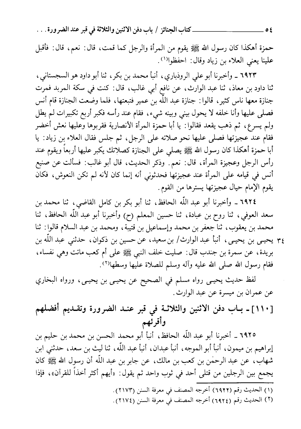 6925 - أَخْبَرَنَا أَبُو عَبْدِ اللهِ الْحَافِظُ، أنبأ أَبُو مُحَمَّدٍ الْحَسَنُ بْنُ مُحَمَّدِ بْنِ حَلِيمِ بْنِ إِبْرَاهِيمَ بْنِ مَيْمُونٍ، أنبأ أَبُو الْمُوجَّهِ، أنبأ عَبْدَانُ، أنبأ عَبْدُ اللهِ، ثنا لَيْثُ بْنُ سَعْدٍ، حَدَّثَنِي ابْنُ شِهَابٍ، عَنْ عَبْدِ الرَّحْمَنِ بْنِ كَعْبِ بْنِ مَالِكٍ، عَنْ جَابِرِ بْنِ عَبْدِ اللهِ: أَنَّ رَسُولَ اللهِ صَلَّى اللهُ عَلَيْهِ وَسَلَّمَ كَانَ §يَجْمَعُ بَيْنَ الرَّجُلَيْنِ مِنْ قَتْلَى أُحُدٍ فِي ثَوْبٍ وَاحِدٍ، ثُمَّ يَقُولُ: " أَيُّهُمْ أَكْثَرُ أَخْذًا لِلْقُرْآنِ؟ " فَإِذَا -[55]- أُشِيرَ إِلَى أَحَدِهِمَا قَدَّمَهُ فِي اللَّحْدِ، وَقَالَ " أَنَا شَهِيدٌ عَلَى هَؤُلَاءِ يَوْمَ الْقِيَامَةِ "، وَأَمَرَ بِدَفْنِهِمْ بِدِمَائِهِمْ، وَلَمْ يُصَلِّ عَلَيْهِمْ، وَلَمْ يُغَسِّلْهُمْ " رَوَاهُ الْبُخَارِيُّ فِي الصَّحِيحِ عَنْ مُحَمَّدِ بْنِ مُقَاتِلٍ، عَنِ ابْنِ الْمُبَارَكِ وَفِيهِ بَعْضُ الِاخْتِصَارِ، وَرَوَاهُ بِطُولِهِ عَنْ عَبْدِ اللهِ بْنِ يُوسُفَ، وَقُتَيْبَةَ، عَنِ اللَّيْثِ