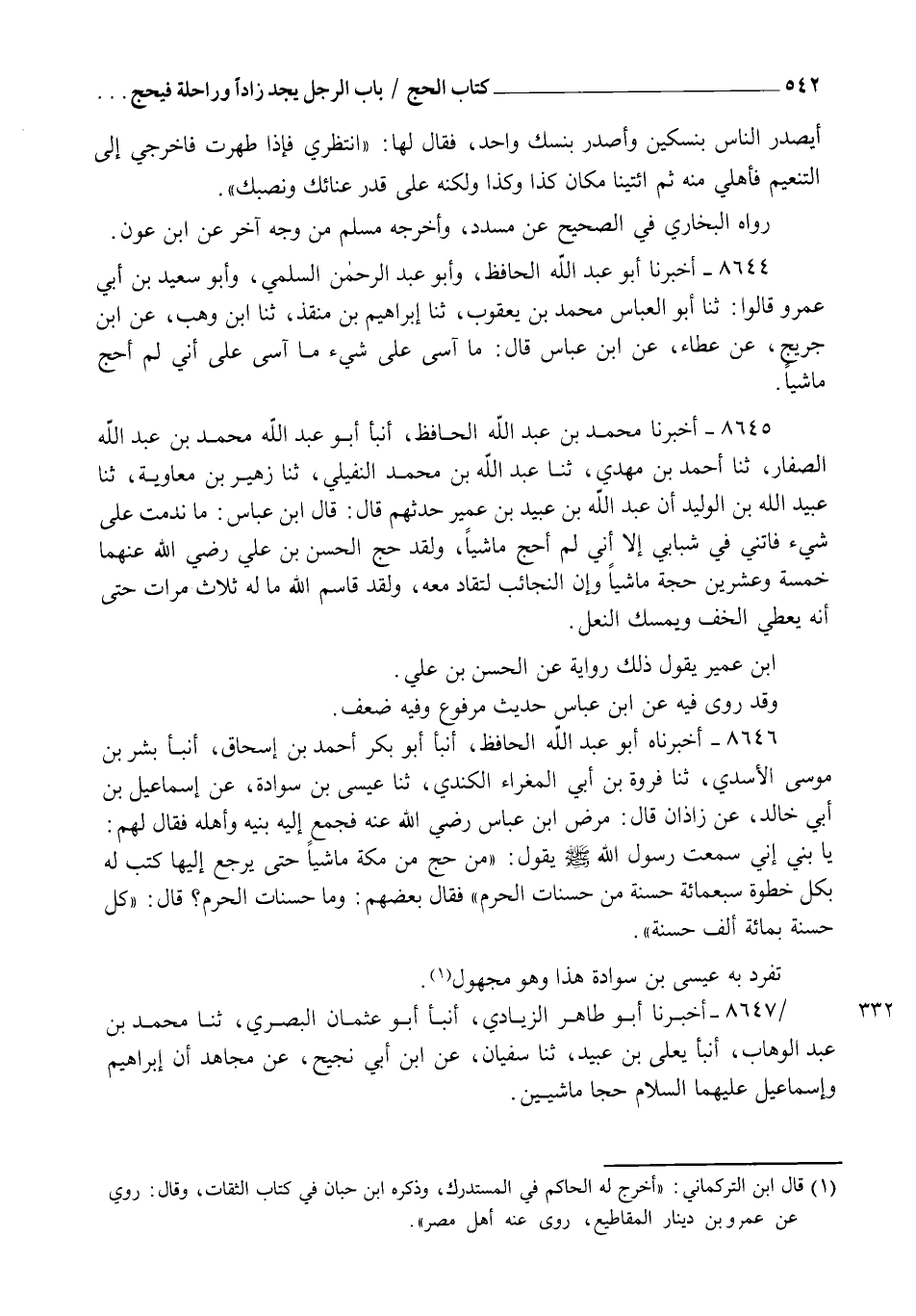 8645 - أَخْبَرَنَا مُحَمَّدُ بْنُ عَبْدِ اللهِ الْحَافِظُ، أنبأ أَبُو عَبْدِ اللهِ، مُحَمَّدُ بْنُ عَبْدِ اللهِ الصَّفَّارُ , ثنا أَحْمَدُ بْنُ مَهْدِيٍّ، ثنا عَبْدُ اللهِ بْنُ مُحَمَّدٍ النُّفَيْلِيُّ، ثنا زُهَيْرُ بْنُ مُعَاوِيَةَ، ثنا عُبَيْدُ اللهِ بْنُ الْوَلِيدِ، أَنَّ عَبْدَ اللهِ بْنَ عُبَيْدِ بْنِ عُمَيْرٍ حَدَّثَهُمْ قَالَ: قَالَ ابْنُ عَبَّاسٍ: §" مَا نَدِمْتُ عَلَى شَيْءٍ فَاتَنِي فِي شَبَابِي إِلَّا أَنِّي لَمْ أَحُجَّ مَاشِيًا "، وَلَقَدْ حَجَّ الْحَسَنُ بْنُ عَلِيٍّ رَضِيَ اللهُ عَنْهُمَا خَمْسَةً وَعِشْرِينَ حَجَّةً مَاشِيًا وَإِنَّ النَّجَائِبَ لَتُقَادُ مَعَهُ , لَقَدْ قَاسَمَ اللهَ مَالَهُ ثَلَاثَ مَرَّاتٍ حَتَّى أَنَّهُ يُعْطِي الْخُفَّ وَيُمْسِكُ النَّعْلَ. ابْنُ عُمَيْرٍ يَقُولُ: ذَلِكَ رِوَايَةً عَنِ الْحَسَنِ بْنِ عَلِيٍّ وَقَدْ رُوِيَ فِيهِ عَنِ ابْنِ عَبَّاسٍ حَدِيثٌ مَرْفُوعٌ وَفِيهِ ضَعْفٌ