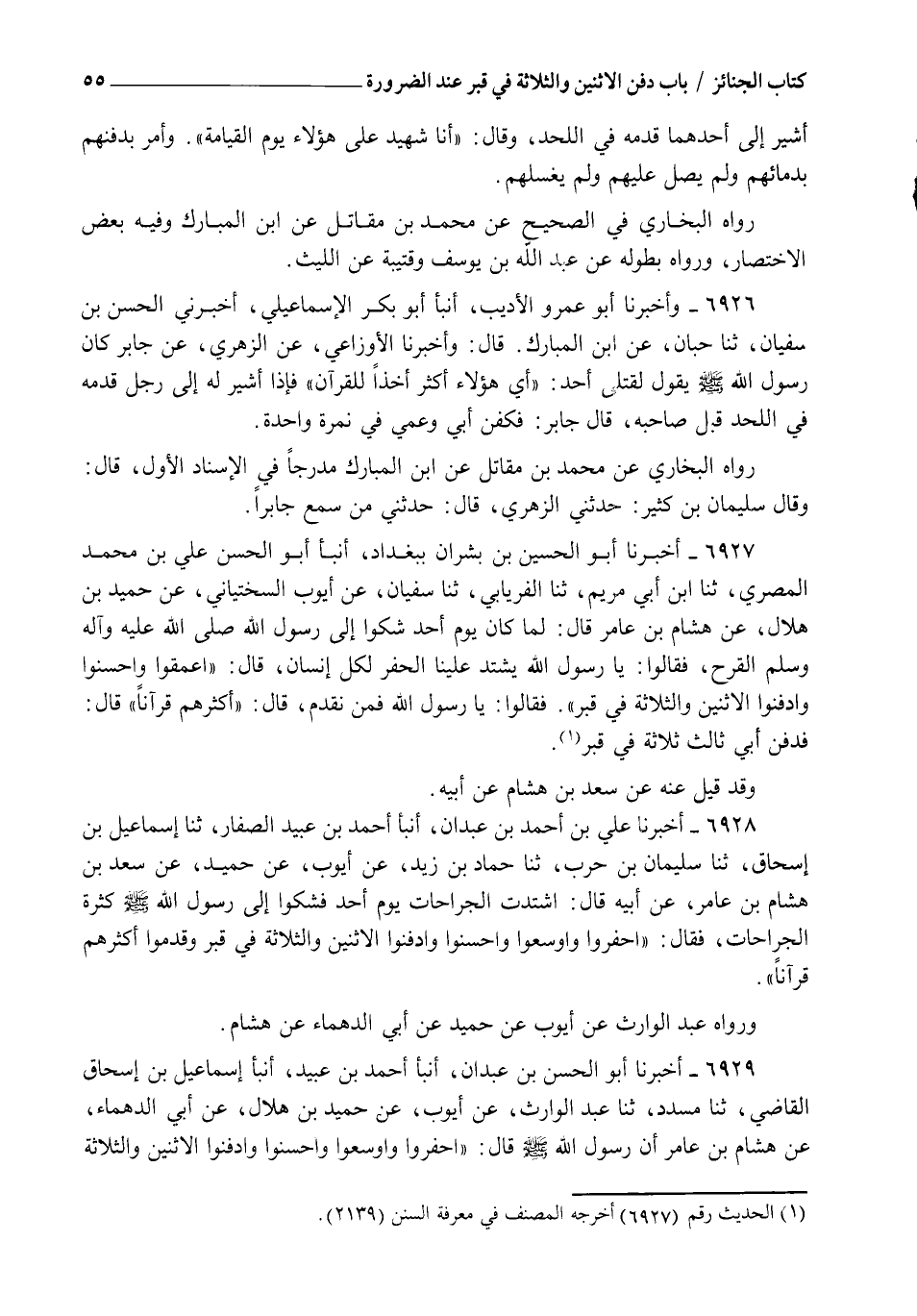 6927 - أَخْبَرَنَا أَبُو الْحُسَيْنِ بْنُ بِشْرَانَ، بِبَغْدَادَ، أنبأ أَبُو الْحَسَنِ عَلِيُّ بْنُ مُحَمَّدٍ الْمِصْرِيُّ، ثنا ابْنُ أَبِي مَرْيَمَ، ثنا الْفِرْيَابِيُّ، ثنا سُفْيَانُ، عَنْ أَيُّوبَ السَّخْتِيَانِيِّ، عَنْ حُمَيْدِ بْنِ هِلَالٍ، عَنْ هِشَامِ بْنِ عَامِرٍ، قَالَ: لَمَّا كَانَ يَوْمُ أُحُدٍ شَكَوْا إِلَى رَسُولِ اللهِ صَلَّى الله عَلَيْهِ وَآلِهِ وَسَلَّمَ الْقَرْحَ، فَقَالُوا: يَا رَسُولَ اللهِ يَشْتَدُّ عَلَيْنَا الْحَفْرُ لِكُلِّ إِنْسَانٍ، قَالَ: " §أَعْمِقُوا وَأَحْسِنُوا وَادْفِنُوا الِاثْنَيْنِ وَالثَّلَاثَةَ فِي قَبْرٍ "، فَقَالُوا يَا رَسُولَ اللهِ فَمَنْ نُقَدِّمُ، قَالَ: " أَكْثَرُهُمْ قُرْآنًا "، قَالَ فَدُفِنَ أَبِي ثَالِثَ ثَلَاثَةٍ فِي قَبْرٍ " وَقَدْ قِيلَ عَنْهُ عَنْ سَعْدِ بْنِ هِشَامٍ، عَنْ أَبِيهِ