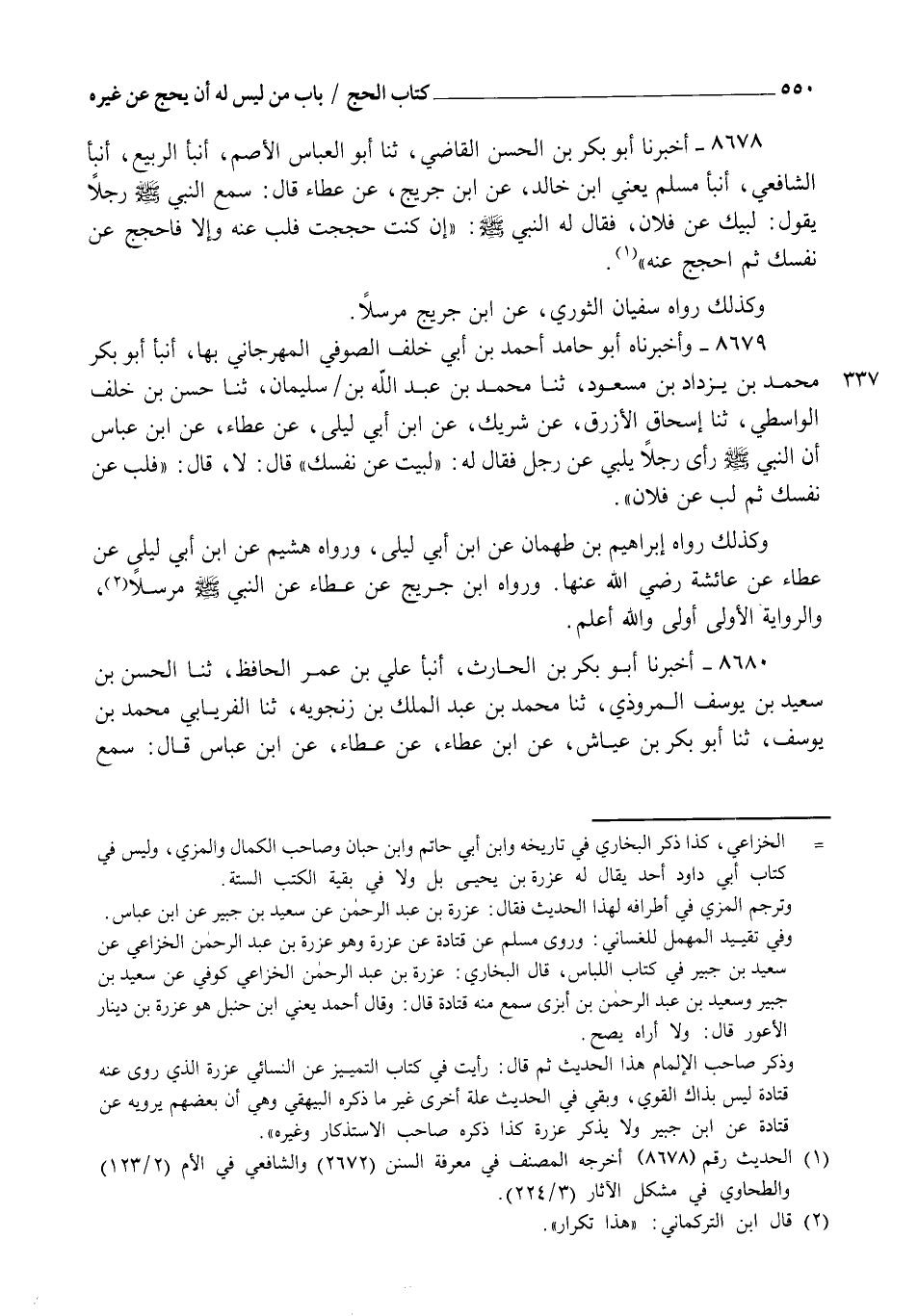 8679 - وَأَخْبَرَنَاهُ أَبُو حَامِدٍ أَحْمَدُ بْنُ أَبِي خَلَفٍ الصُّوفِيُّ الْمِهْرَجَانِيُّ بِهَا , أنبأ أَبُو بَكْرٍ مُحَمَّدُ بْنُ يَزْدَادَ بْنِ مَسْعُودٍ , ثنا مُحَمَّدُ بْنُ عَبْدِ اللهِ بْنِ سُلَيْمَانَ، ثنا حَسَنُ بْنُ خَلَفٍ الْوَاسِطِيُّ، ثنا إِسْحَاقُ الْأَزْرَقُ، عَنْ شَرِيكٍ، عَنِ ابْنِ أَبِي لَيْلَى، عَنْ عَطَاءٍ، عَنِ ابْنِ عَبَّاسٍ، أَنَّ النَّبِيَّ صَلَّى اللهُ عَلَيْهِ وَسَلَّمَ رَأَى رَجُلًا يُلَبِّي عَنْ رَجُلٍ فَقَالَ لَهُ: " §لَبَيْتَ عَنْ نَفْسِكِ "؟ قَالَ: لَا , قَالَ: " فَلَبِّ عَنْ نَفْسِكَ ثُمَّ لَبِّ عَنْ فُلَانٍ " وَكَذَلِكَ رَوَاهُ إِبْرَاهِيمُ بْنُ طَهْمَانَ عَنِ ابْنِ أَبِي لَيْلَى، وَرَوَاهُ هُشَيْمٌ عَنِ ابْنِ أَبِي لَيْلَى , عَنْ عَطَاءٍ عَنْ عَائِشَةَ رَضِيَ اللهُ عَنْهَا وَرَوَاهُ ابْنُ جُرَيْجٍ عَنْ عَطَاءٍ عَنِ النَّبِيِّ صَلَّى اللهُ عَلَيْهِ وَسَلَّمَ مُرْسَلًا، وَالرِّوَايَةُ الْأُولَى أَوْلَى وَاللهُ أَعْلَمُ