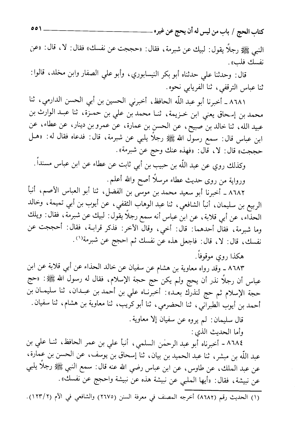 8682 - أَخْبَرَنَا أَبُو سَعِيدٍ مُحَمَّدُ بْنُ مُوسَى بْنِ الْفَضْلِ , ثنا أَبُو الْعَبَّاسِ الْأَصَمُّ، أنبأ الرَّبِيعُ بْنُ سُلَيْمَانَ، أنبأ الشَّافِعِيُّ، ثنا عَبْدُ الْوَهَّابِ الثَّقَفِيُّ، عَنْ أَيُّوبَ بْنِ أَبِي تَمِيمَةَ، وَخَالِدٌ الْحَذَّاءُ، عَنْ أَبِي قِلَابَةَ، عَنِ ابْنِ عَبَّاسٍ، أَنَّهُ سَمِعَ رَجُلًا، يَقُولُ: لَبَّيْكَ عَنْ شُبْرُمَةَ، فَقَالَ: " وَيْلَكَ وَمَا شُبْرُمَةُ " فَقَالَ أَحَدُهُمَا قَالَ: أَخِي , وَقَالَ: الْآخَرُ فَذَكَرَ قَرَابَةً , فَقَالَ: " أَحَجَجْتَ عَنْ نَفْسِكَ؟ " قَالَ: لَا , قَالَ: §" فَاجْعَلْ هَذِهِ عَنْ نَفْسِكَ ثُمَّ احْجُجْ عَنْ شُبْرُمَةَ " هَكَذَا رُوِيَ مَوْقُوفًا