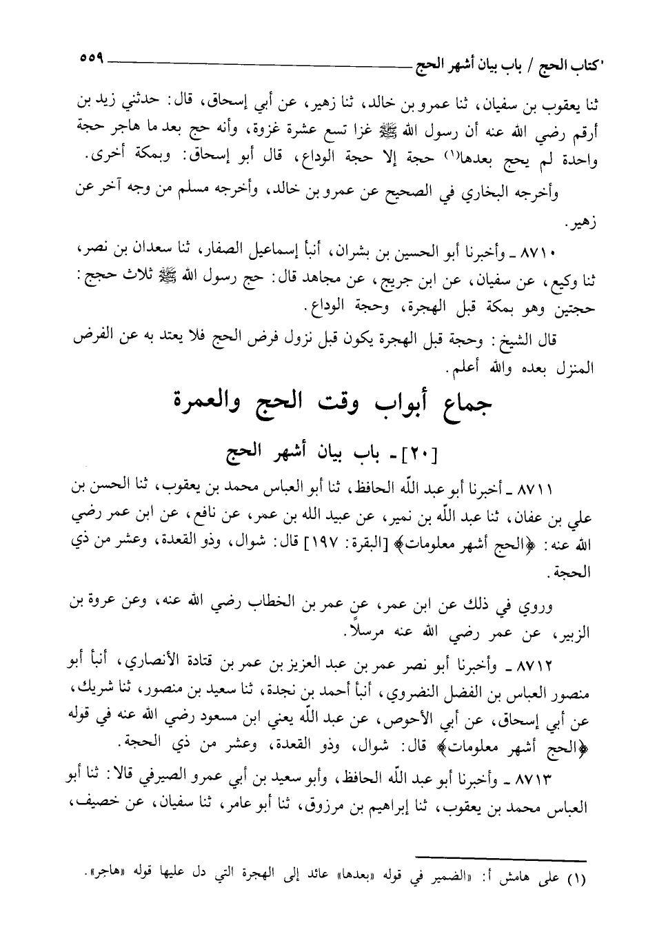 8711 - أَخْبَرَنَا أَبُو عَبْدِ اللهِ الْحَافِظُ، ثنا أَبُو الْعَبَّاسِ مُحَمَّدُ بْنُ يَعْقُوبَ , ثنا الْحَسَنُ بْنُ عَلِيِّ بْنِ عَفَّانَ، ثنا عَبْدُ اللهِ بْنُ نُمَيْرٍ، عَنْ عُبَيْدِ اللهِ بْنِ عُمَرَ، عَنْ نَافِعٍ، عَنِ ابْنِ عُمَرَ رَضِيَ اللهُ عَنْهُ {الْحَجُّ أَشْهُرٌ مَّعْلُومَاتٌ} [البقرة: 197] قَالَ: §" شَوَّالٌ وَذُو الْقَعْدَةِ وَعَشْرٌ مِنْ ذِي الْحِجَّةِ " وَرُوِيَ فِي ذَلِكَ عَنِ ابْنِ عُمَرَ عَنْ عُمَرَ بْنِ الْخَطَّابِ رَضِيَ اللهُ عَنْهُ وَعَنْ عُرْوَةَ بْنِ الزُّبَيْرِ عَنْ عُمَرَ رَضِيَ اللهُ عَنْهُ مُرْسَلًا