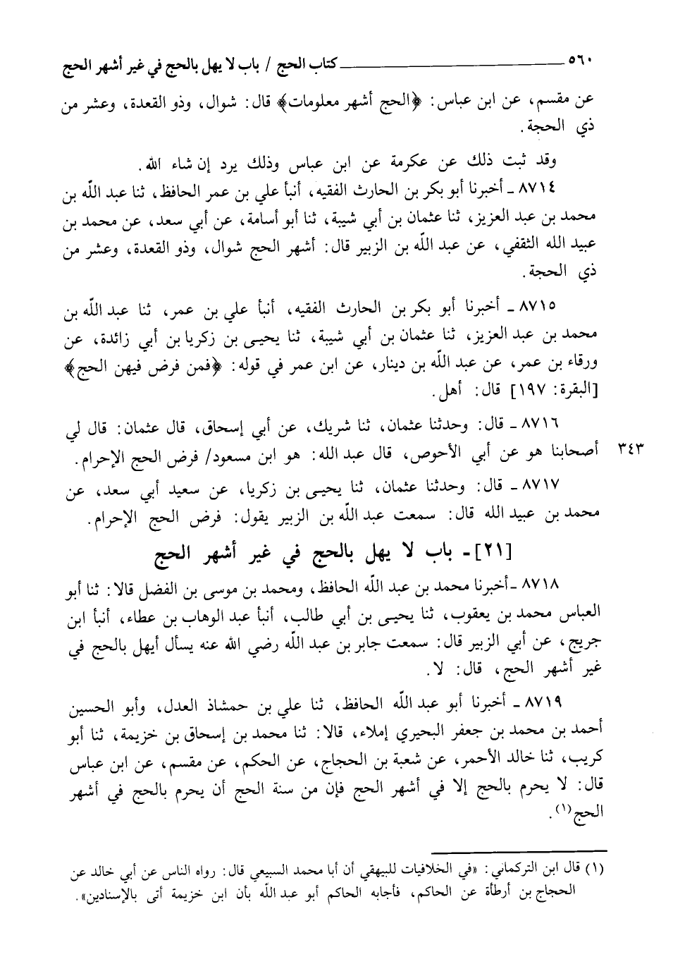 8719 - أَخْبَرَنَا أَبُو عَبْدِ اللهِ الْحَافِظُ، ثنا عَلِيُّ بْنُ حَمْشَاذٍ الْعَدْلُ، وَأَبُو الْحُسَيْنِ أَحْمَدُ بْنُ مُحَمَّدِ بْنِ جَعْفَرٍ الْبُحَيْرِيُّ إِمْلَاءً , قَالَا: ثنا مُحَمَّدُ بْنُ إِسْحَاقَ بْنِ خُزَيْمَةَ، ثنا أَبُو كُرَيْبٍ، ثنا أَبُو خَالِدٍ الْأَحْمَرُ، عَنْ شُعْبَةَ بْنِ الْحَجَّاجِ، عَنِ الْحَكَمِ، عَنْ مِقْسَمٍ، عَنِ ابْنِ عَبَّاسٍ، قَالَ: §" لَا يُحْرَمُ بِالْحَجِّ إِلَّا فِي أَشْهُرِ الْحَجِّ فَإِنَّ مِنْ سُنَّةِ الْحَجِّ أَنْ يُحْرَمَ بِالْحَجِّ فِي أَشْهُرِ الْحَجِّ "