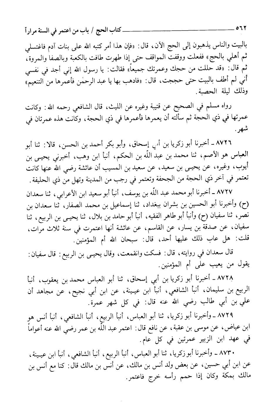 8729 - وَأَخْبَرَنَا أَبُو زَكَرِيَّا، ثنا أَبُو الْعَبَّاسِ، أنبأ الرَّبِيعُ، أنبأ الشَّافِعِيُّ، أنبأ أَنَسٌ هُوَ ابْنُ عِيَاضٍ عَنْ مُوسَى بْنِ عُقْبَةَ، عَنْ نَافِعٍ، قَالَ: §اعْتَمَرَ عَبْدُ اللهِ بْنُ عُمَرَ رَضِيَ اللهُ عَنْهُ أَعْوَامًا فِي عَهْدِ ابْنِ الزُّبَيْرِ عُمْرَتَيْنِ فِي كُلِّ عَامٍ