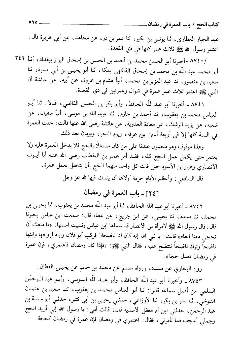8740 - أَخْبَرَنَا أَبُو الْحَسَنِ مُحَمَّدُ بْنُ أَحْمَدَ بْنِ الْحَسَنِ بْنِ إِسْحَاقَ الْبَزَّازُ بِبَغْدَادَ , أنبأ أَبُو مُحَمَّدٍ عَبْدُ اللهِ بْنُ مُحَمَّدِ بْنِ إِسْحَاقَ الْفَاكِهِيُّ، بِمَكَّةَ ثنا أَبُو يَحْيَى بْنُ أَبِي مَسَرَّةَ، ثنا سَعِيدُ بْنُ مَنْصُورٍ، ثنا عَبْدُ الْعَزِيزِ بْنُ مُحَمَّدٍ، أنبأ هِشَامُ بْنُ عُرْوَةَ، عَنْ أَبِيهِ، عَنْ عَائِشَةَ أَنَّ النَّبِيَّ صَلَّى اللهُ عَلَيْهِ وَسَلَّمَ §اعْتَمَرَ ثَلَاثَ عُمَرٍ عُمْرَةً فِي شَوَّالٍ وَعُمْرَتَيْنِ فِي ذِي الْقَعْدَةِ