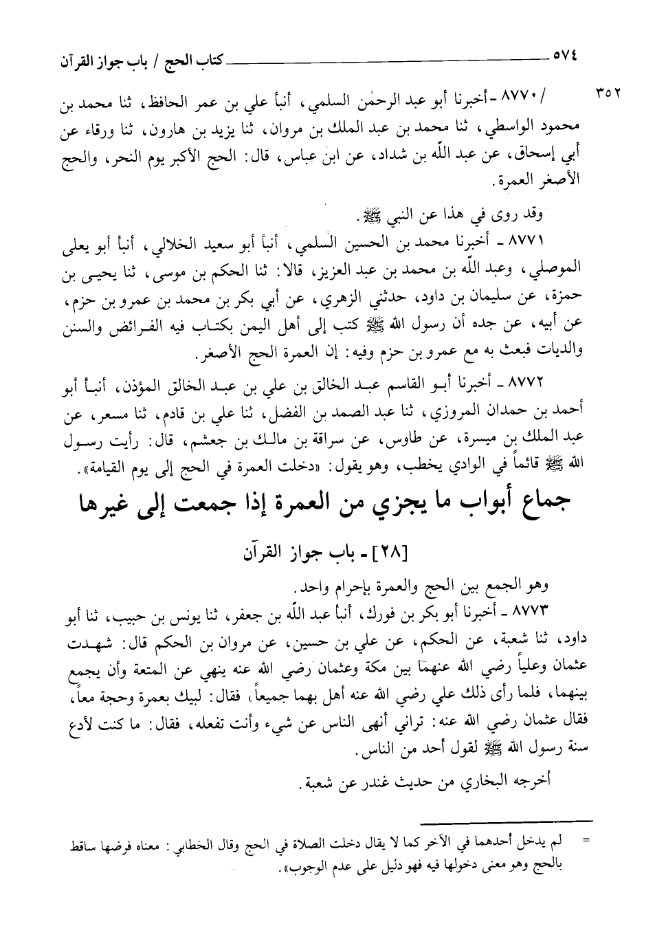 8772 - أَخْبَرَنَا أَبُو الْقَاسِمِ عَبْدُ الْخَالِقِ بْنُ عَلِيِّ بْنِ عَبْدِ الْخَالِقِ الْمُؤَذِّنُ، أنبأ أَبُو أَحْمَدَ بْنُ حَمْدَانَ الْمَرْوَزِيُّ، ثنا عَبْدُ الصَّمَدِ بْنُ الْفَضْلِ، ثنا عَلِيُّ بْنُ قَادِمٍ، ثنا مِسْعَرٌ، عَنْ عَبْدِ الْمَلِكِ بْنِ مَيْسَرَةَ، عَنْ طَاوُسٍ عَنْ سُرَاقَةَ بْنِ مَالِكِ بْنِ جُعْشُمٍ، قَالَ: رَأَيْتُ رَسُولَ اللهِ صَلَّى اللهُ عَلَيْهِ وَسَلَّمَ قَائِمًا فِي الْوَادِي يَخْطُبُ وَهُوَ يَقُولُ: §" دَخَلَتِ الْعُمْرَةُ فِي الْحَجِّ إِلَى يَوْمِ الْقِيَامَةِ "