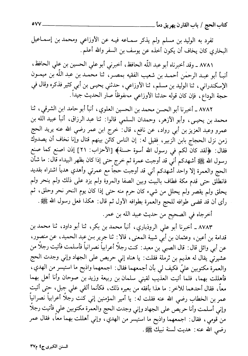 8783 - أَخْبَرَنَا أَبُو عَلِيٍّ الرُّوذْبَارِيُّ، أنبأ مُحَمَّدُ بْنُ بَكْرٍ، ثنا أَبُو دَاوُدَ، ثنا مُحَمَّدُ بْنُ قُدَامَةَ بْنِ أَعْيَنَ، وَعُثْمَانُ بْنُ أَبِي شَيْبَةَ، الْمَعْنَى قَالَا: ثنا جَرِيرُ بْنُ عَبْدِ الْحَمِيدِ، عَنْ مَنْصُورٍ، عَنْ أَبِي وَائِلٍ، قَالَ: قَالَ الصُّبَيُّ بْنُ مَعْبَدٍ: كُنْتُ رَجُلًا أَعْرَابِيًّا نَصْرَانِيًّا فَأَسْلَمْتُ فَأَتَيْتُ رَجُلًا مِنْ عَشِيرَتِي يُقَالُ لَهُ هُذَيْمُ بْنُ ثُرْمُلَةَ فَقُلْتُ: يَا هَنَاهُ إِنِّي حَرِيصٌ عَلَى الْجِهَادِ وَإِنِّي وَجَدْتُ الْحَجَّ وَالْعُمْرَةَ مَكْتُوبَيْنِ عَلَيَّ فَكَيْفَ لِي بِأَنْ أَجْمَعَهُمَا؟ فَقَالَ: اجْمَعْهُمَا وَاذْبَحْ مَا اسْتَيْسَرَ مِنَ الْهَدْيِ، فَأَهْلَلْتُ بِهِمَا فَلَمَّا أَتَيْتُ الْعُذَيْبَ لَقِيَنِي سَلْمَانُ بْنُ رَبِيعَةَ وَزَيْدُ بْنُ صُوحَانَ وَأَنَا أُهِلُّ بِهِمَا مَعًا فَقَالَ أَحَدُهُمَا لِلْآخَرِ: مَا هَذَا بِأَفْقَهَ مِنْ بَعِيرِهِ ذَلِكَ، فَكَأَنَّمَا أُلْقِيَ عَلَيَّ جَبَلٌ حَتَّى أَتَيْتُ عُمَرَ بْنَ الْخَطَّابِ رَضِيَ اللهُ عَنْهُ , فَقُلْتُ لَهُ: يَا أَمِيرَ الْمُؤْمِنِينَ إِنِّي كُنْتُ رَجُلًا أَعْرَابِيًّا نَصْرَانِيًّا وَإِنِّي أَسْلَمْتُ وَأَنَا حَرِيصٌ عَلَى الْجِهَادِ وَإِنِّي وَجَدْتُ الْحَجَّ وَالْعُمْرَةَ مَكْتُوبَيْنِ عَلَيَّ فَأَتَيْتُ رَجُلًا مِنْ قَوْمِي فَقَالَ اجْمَعْهُمَا وَاذْبَحْ مَا اسْتَيْسَرَ مِنَ الْهَدْيِ، وَإِنِّي أَهْلَلْتُ بِهِمَا مَعًا , فَقَالَ عُمَرُ رَضِيَ اللهُ عَنْهُ: §" هُدِيتَ لِسُنَّةِ نَبِيِّكَ صَلَّى اللهُ عَلَيْهِ وَسَلَّمَ "