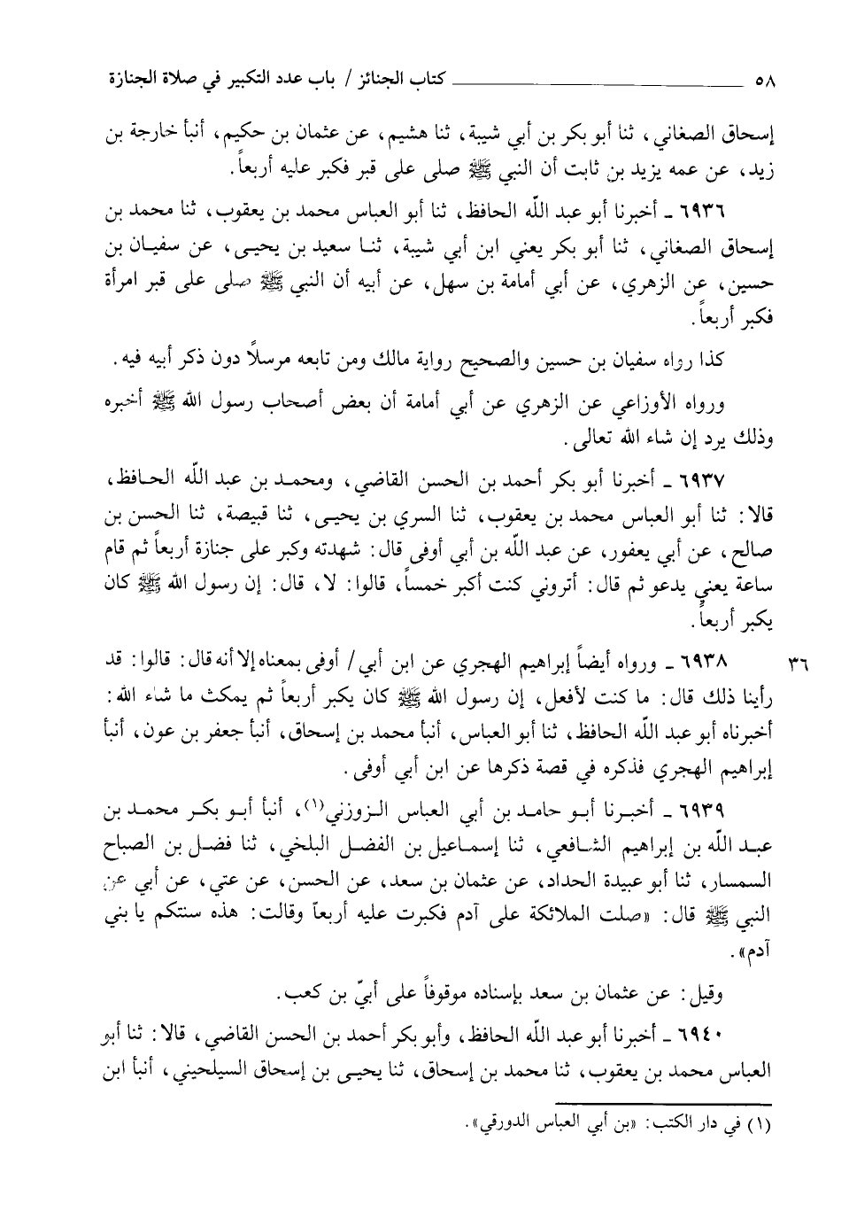 6936 - أَخْبَرَنَا أَبُو عَبْدِ اللهِ الْحَافِظُ، ثنا أَبُو الْعَبَّاسِ مُحَمَّدُ بْنُ يَعْقُوبَ، ثنا مُحَمَّدُ بْنُ إِسْحَاقَ الصَّغَانِيُّ، ثنا أَبُو بَكْرٍ يَعْنِي ابْنَ أَبِي شَيْبَةَ، ثنا سَعِيدُ بْنُ يَحْيَى، عَنْ سُفْيَانَ بْنِ حُسَيْنٍ، عَنِ الزُّهْرِيِّ، عَنْ أَبِي أُمَامَةَ بْنِ سَهْلٍ، عَنْ أَبِيهِ: أَنَّ النَّبِيَّ صَلَّى اللهُ عَلَيْهِ وَسَلَّمَ: §صَلَّى عَلَى قَبْرِ امْرَأَةٍ فَكَبَّرَ أَرْبَعًا كَذَا رَوَاهُ سُفْيَانُ بْنُ حُسَيْنٍ وَالصَّحِيحُ رِوَايَةُ مَالِكٍ وَمَنْ تَابَعَهُ مُرْسَلًا دُونَ ذِكْرِ أَبِيهِ فِيهِ، وَرَوَاهُ الْأَوْزَاعِيُّ عَنِ الزُّهْرِيِّ عَنْ أَبِي أُمَامَةَ أَنَّ بَعْضَ أَصْحَابِ رَسُولِ اللهِ صَلَّى اللهُ عَلَيْهِ وَسَلَّمَ أَخْبَرَهُ وَذَلِكَ يَرِدُ إِنْ شَاءَ اللهُ تَعَالَى
