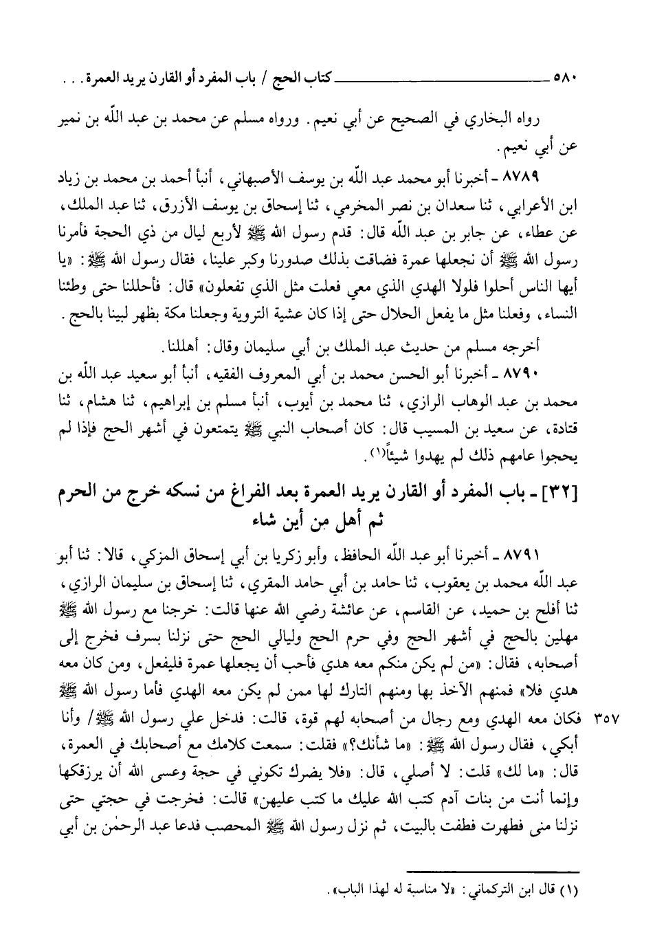 8791 - أَخْبَرَنَا أَبُو عَبْدِ اللهِ الْحَافِظُ، وَأَبُو زَكَرِيَّا بْنُ أَبِي إِسْحَاقَ الْمُزَكِّي قَالَا: ثنا أَبُو عَبْدِ اللهِ، مُحَمَّدُ بْنُ يَعْقُوبَ ثنا خَالِدُ بْنُ أَبِي حَامِدٍ الْمُقْرِئُ، ثنا إِسْحَاقُ بْنُ سُلَيْمَانَ الرَّازِيُّ، ثنا أَفْلَحُ بْنُ حُمَيْدٍ، عَنِ الْقَاسِمِ عَنْ عَائِشَةَ، رَضِيَ اللهُ عَنْهَا قَالَتْ: خَرَجْنَا مَعَ رَسُولِ اللهِ صَلَّى اللهُ عَلَيْهِ وَسَلَّمَ مُهِلِّينَ بِالْحَجِّ فِي أَشْهُرِ الْحَجِّ وَفِي حَرَمِ الْحَجِّ وَلَيَالِي الْحَجِّ حَتَّى نَزَلْنَا بِسَرِفَ فَخَرَجَ إِلَى أَصْحَابِهِ فَقَالَ: §" مَنْ لَمْ يَكُنْ مِنْكُمْ مَعَهُ هَدْيٌ فَأَحَبَّ أَنْ يَجْعَلَهَا عُمْرَةً فَلْيَفْعَلْ، وَمَنْ كَانَ مَعَهُ هَدْيٌ فَلَا " فَمِنْهُمُ الْآخِذُ بِهَا وَمِنْهُمُ التَّارِكُ لَهَا مِمَّنْ لَمْ يَكُنْ مَعَهُ الْهَدْيُ، فَأَمَّا رَسُولُ اللهِ صَلَّى اللهُ عَلَيْهِ وَسَلَّمَ فَكَانَ مَعَهُ الْهَدْيُ وَمَعَ رِجَالٍ مِنْ أَصْحَابِهِ لَهُمْ قُوَّةٌ , قَالَتْ: فَدَخَلَ عَلَيَّ رَسُولُ اللهِ صَلَّى اللهُ عَلَيْهِ وَسَلَّمَ وَأَنَا أَبْكِي فَقَالَ رَسُولُ اللهِ صَلَّى اللهُ عَلَيْهِ وَسَلَّمَ: " مَا شَأْنُكِ " فَقُلْتُ: سَمِعْتُ كَلَامَكَ مَعَ أَصْحَابِكَ فِي الْعُمْرَةِ قَالَ: " مَا لَكِ " قُلْتُ لَا أُصَلِّي قَالَ: " فَلَا يَضُرُّكِ تَكُونِي فِي حَجَّةٍ وَعَسَى اللهُ أَنْ يَرْزُقَكِهَا وَإِنَّمَا أَنْتِ مِنْ بَنَاتِ آدَمَ كَتَبَ اللهُ عَلَيْكِ مَا كَتَبَ عَلَيْهِنَّ " قَالَتْ: فَخَرَجْتُ فِي حَجَّتِي حَتَّى نَزَلْنَا مِنًى فَطَهُرْتُ فَطُفْتُ بِالْبَيْتِ ثُمَّ نَزَلَ رَسُولُ اللهِ صَلَّى اللهُ عَلَيْهِ وَسَلَّمَ الْمُحَصَّبَ فَدَعَا عَبْدَ الرَّحْمَنِ بْنَ أَبِي -[581]- بَكْرٍ , فَقَالَ: " اخْرُجْ بِأُخْتِكَ مِنَ الْحَرَمِ فَلْتُهِلَّ بِالْعُمْرَةِ ثُمَّ تَطُوفُ بِالْبَيْتِ وَأَفْرِغَا حَتَّى تَأْتِيَانِي فَإِنِّي أَنْتَظِرْكُمَا هَا هُنَا " قَالَتْ: فَخَرَجْنَا فَأَهْلَلْنَا ثُمَّ طُفْتُ بِالْبَيْتِ وَبِالصَّفَا وَالْمَرْوَةِ فَجِئْنَا رَسُولَ اللهِ صَلَّى اللهُ عَلَيْهِ وَسَلَّمَ وَهُوَ فِي مَنْزِلِهِ مِنْ جَوْفِ اللَّيْلِ، فَقَالَ: " هَلْ فَرَغْتُمْ؟ " قُلْتُ: نَعَمْ، فَأَذَّنَ فِي أَصْحَابِهِ بِالرَّحِيلِ فَخَرَجَ فَمَرَّ بِالْبَيْتِ فَطَافَ بِهِ قَبْلَ صَلَاةِ الصُّبْحِ ثُمَّ خَرَجَ إِلَى الْمَدِينَةِ. رَوَاهُ الْبُخَارِيُّ فِي الصَّحِيحِ عَنْ أَبِي نُعَيْمٍ عَنْ أَفْلَحَ وَرَوَاهُ مُسْلِمٌ عَنِ ابْنِ نُمَيْرٍ عَنْ إِسْحَاقَ بْنِ سُلَيْمَانَ