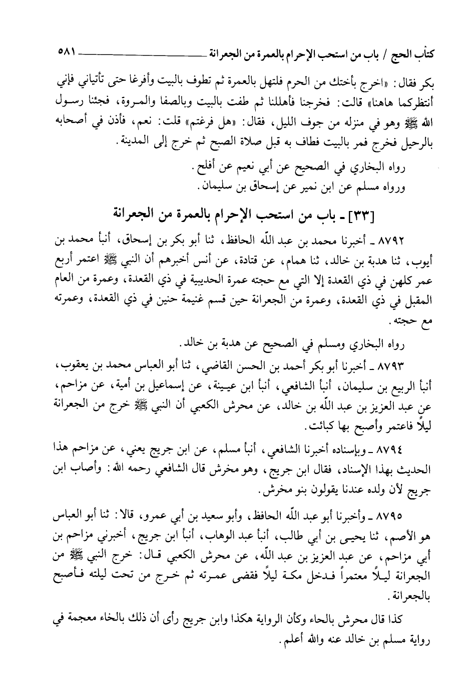 8795 - وَأَخْبَرَنَا أَبُو عَبْدِ اللهِ الْحَافِظُ، وَأَبُو سَعِيدِ بْنُ أَبِي عَمْرٍو قَالَا: ثنا أَبُو الْعَبَّاسِ، هُوَ الْأَصَمُّ ثنا يَحْيَى بْنُ أَبِي طَالِبٍ، أنبأ عَبْدُ الْوَهَّابِ، أنبأ ابْنُ جُرَيْجٍ، أَخْبَرَنِي مُزَاحِمُ بْنُ أَبِي مُزَاحِمٍ، عَنْ عَبْدِ الْعَزِيزِ بْنِ عَبْدِ اللهِ، عَنْ مُحَرِّشٍ الْكَعْبِيِّ، قَالَ §خَرَجَ النَّبِيُّ صَلَّى اللهُ عَلَيْهِ وَسَلَّمَ مِنَ الْجِعْرَانَةِ لَيْلًا مُعْتَمِرًا فَدَخَلَ مَكَّةَ لَيْلًا فَقَضَى عُمْرَتَهُ ثُمَّ خَرَجَ مِنْ تَحْتِ لَيْلَتِهِ فَأَصْبَحَ بِالْجِعْرَانَةِ كَذَا قَالَ مُحَرِّشٌ بِالْحَاءِ وَكَأَنَّ الرِّوَايَةَ هَكَذَا وَابْنُ جُرَيْجٍ رَأَى أَنَّ ذَلِكَ بِالْخَاءِ مُعْجَمَةً فِي رِوَايَةِ مُسْلِمِ بْنِ خَالِدٍ عَنْهُ وَاللهُ أَعْلَمُ