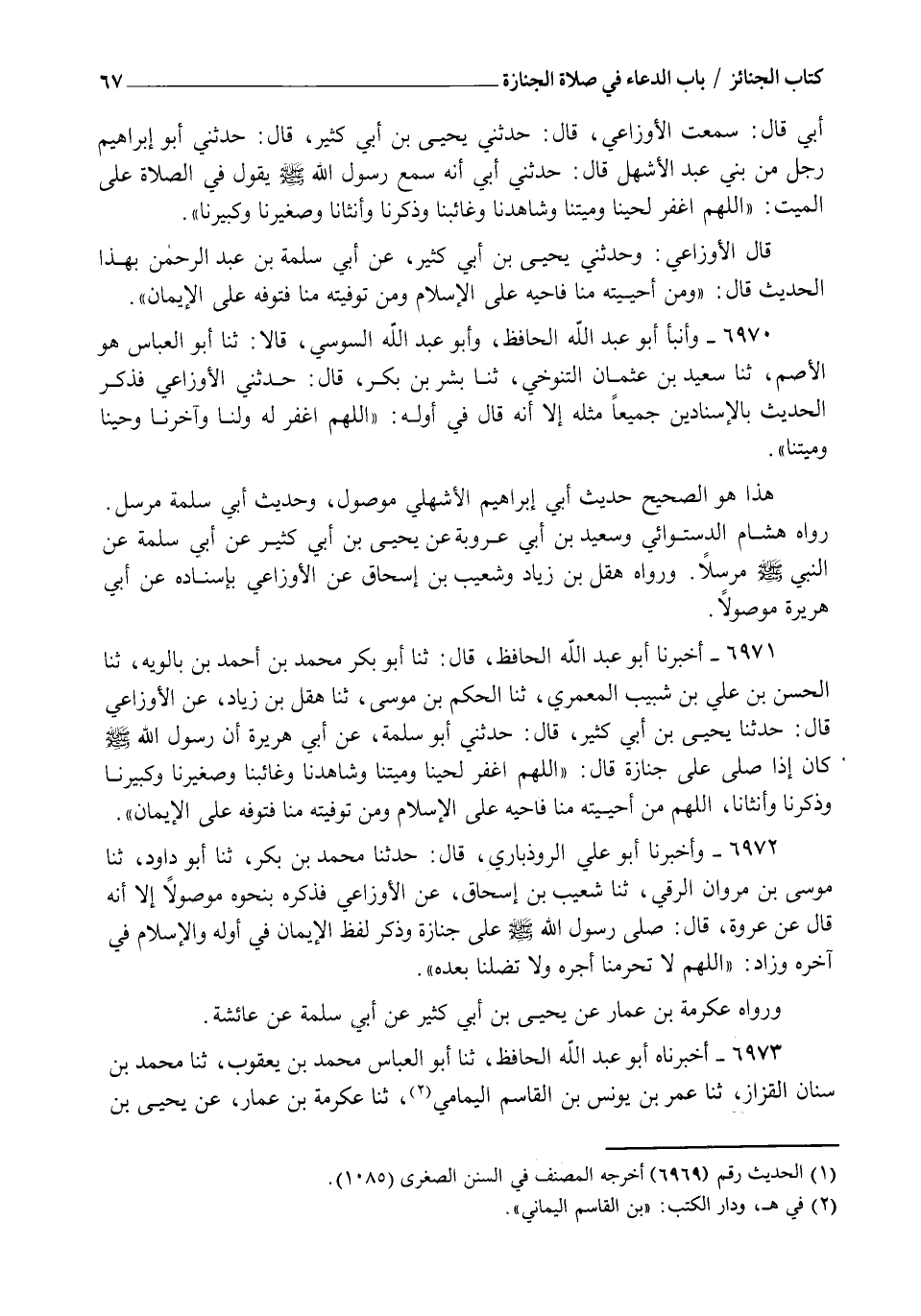6973 - أَخْبَرَنَاهُ أَبُو عَبْدِ اللهِ الْحَافِظُ، ثنا أَبُو الْعَبَّاسِ مُحَمَّدُ بْنُ يَعْقُوبَ، ثنا مُحَمَّدُ بْنُ سِنَانٍ الْقَزَّازُ، ثنا عُمَرُ بْنُ يُونُسَ بْنِ الْقَاسِمِ الْيَمَامِيُّ، ثنا عِكْرِمَةُ بْنُ عَمَّارٍ، عَنْ يَحْيَى بْنِ -[68]- أَبِي كَثِيرٍ، حَدَّثَنِي أَبُو سَلَمَةَ بْنُ عَبْدِ الرَّحْمَنِ، قَالَ: سَأَلْتُ عَائِشَةَ أُمَّ الْمُؤْمِنِينَ رَضِيَ اللهُ عَنْهَا كَيْفَ كَانَتْ صَلَاةُ رَسُولِ اللهِ صَلَّى اللهُ عَلَيْهِ وَسَلَّمَ عَلَى الْمَيِّتِ؟ قَالَتْ: كَانَ يَقُولُ: " §اللهُمَّ اغْفِرْ لِحَيِّنَا، وَمَيِّتِنَا، وَذَكَرِنَا، وَأُنْثَانَا، وَغَائِبِنَا، وَشَاهِدِنَا وَصَغِيرِنَا، وَكَبِيرِنَا اللهُمَّ مَنْ أَحْيَيْتَهُ مِنَّا فَأَحْيِهِ عَلَى الْإِسْلَامِ وَمَنْ تَوَفَّيْتَهُ مِنَّا فَتَوَفَّهُ عَلَى الْإِيمَانِ "، وَرَوَاهُ هَمَّامُ بْنُ يَحْيَى، عَنْ يَحْيَى بْنِ أَبِي كَثِيرٍ، عَنْ عَبْدِ اللهِ بْنِ أَبِي قَتَادَةَ، عَنْ أَبِيهِ، وَعَنْ يَحْيَى، عَنْ أَبِي سَلَمَةَ بِزِيَادَتِهِ دُونَ ذِكْرِ أَبِي هُرَيْرَةَ