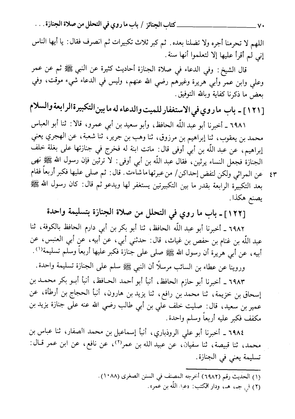 6983 - أَخْبَرَنَا أَبُو حَازِمٍ الْحَافِظُ، أنبأ أَبُو أَحْمَدَ الْحَافِظُ، أنبأ أَبُو بَكْرٍ مُحَمَّدُ بْنُ إِسْحَاقَ بْنِ خُزَيْمَةَ، ثنا مُحَمَّدُ بْنُ رَافِعٍ، ثنا يَزِيدُ بْنُ هَارُونَ، أنبأ الْحَجَّاجُ بْنُ أَرْطَاةَ، عَنْ عُمَيْرِ بْنِ سَعِيدٍ، قَالَ: صَلَّيْتُ خَلْفَ عَلِيِّ بْنِ أَبِي طَالِبٍ رَضِيَ اللهُ عَنْهُ عَلَى جِنَازَةِ يَزِيدَ بْنِ مُكَفَّفٍ، §فَكَبَّرَ عَلَيْهِ أَرْبَعًا وَسَلَّمَ وَاحِدَةً