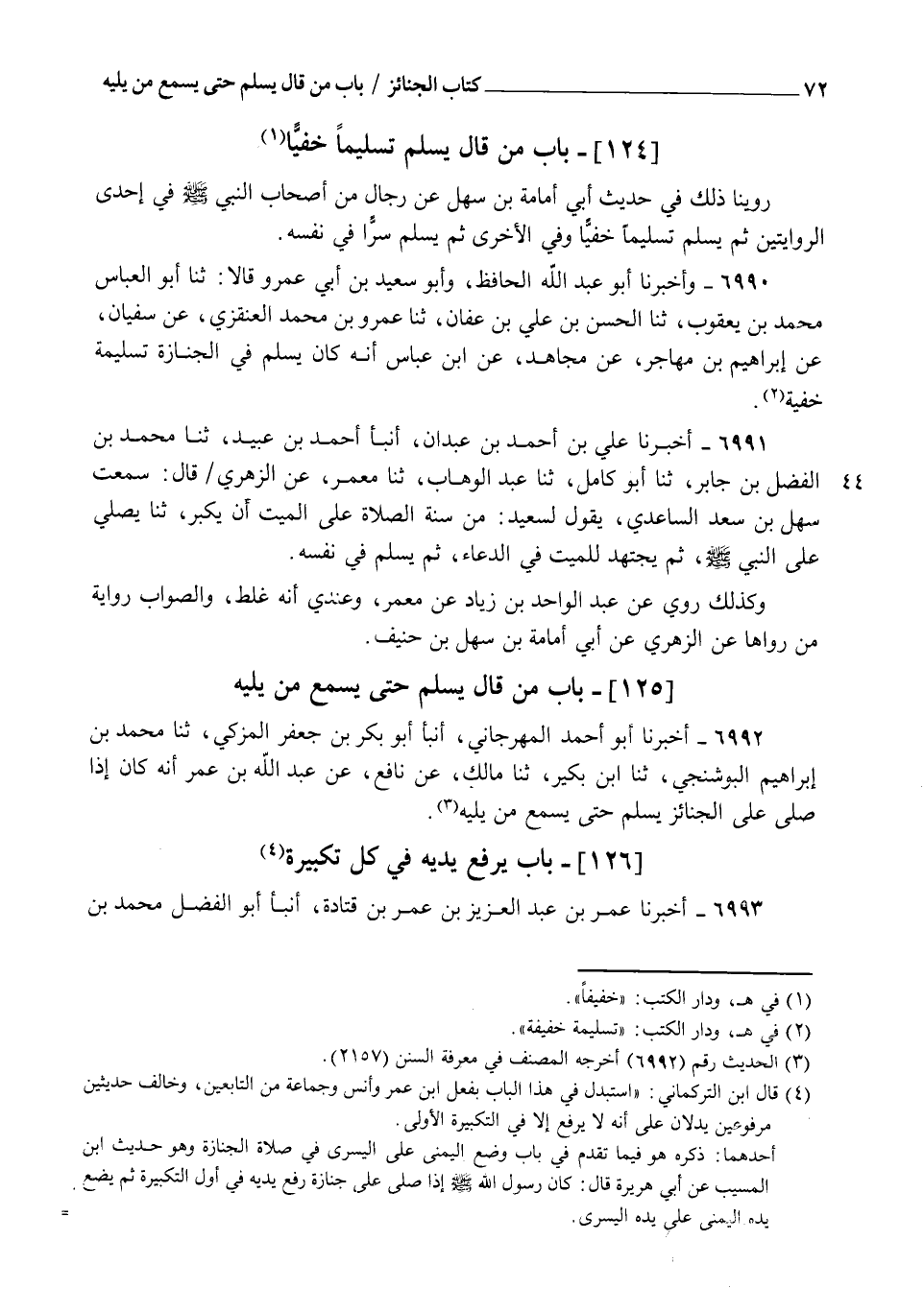 6992 - أَخْبَرَنَا أَبُو أَحْمَدَ الْمِهْرَجَانِيُّ، أنبأ أَبُو بَكْرِ بْنُ جَعْفَرٍ الْمُزَكِّي، ثنا مُحَمَّدُ بْنُ إِبْرَاهِيمَ الْبُوشَنْجِيُّ، ثنا ابْنُ بُكَيْرٍ، ثنا مَالِكٌ، عَنْ نَافِعٍ، عَنْ عَبْدِ اللهِ بْنِ عُمَرَ: §أَنَّهُ كَانَ إِذَا صَلَّى عَلَى الْجَنَائِزِ يُسَلِّمُ حَتَّى يُسْمِعَ مَنْ يَلِيهِ