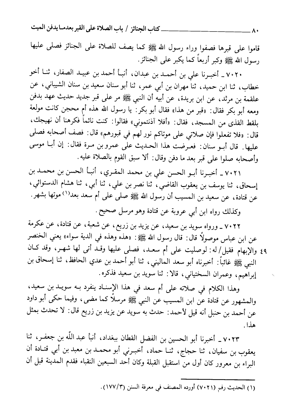 7021 - أَخْبَرَنَا أَبُو الْحَسَنِ عَلِيُّ بْنُ مُحَمَّدٍ الْمُقْرِئُ، أنبأ الْحَسَنُ بْنُ مُحَمَّدِ بْنِ إِسْحَاقَ، ثنا يُوسُفُ بْنُ يَعْقُوبَ الْقَاضِي، ثنا نَصْرُ بْنُ عَلِيٍّ، ثنا أَبِي، ثنا هِشَامٌ الدَّسْتُوَائِيُّ، عَنْ قَتَادَةَ، عَنْ سَعِيدِ بْنِ الْمُسَيِّبِ، أَنَّ رَسُولَ اللهِ صَلَّى اللهُ عَلَيْهِ وَسَلَّمَ: §" صَلَّى عَلَى أُمِّ سَعْدٍ بَعْدَ مَوْتِهَا بِشَهْرٍ " وَكَذَلِكَ رَوَاهُ ابْنُ أَبِي عَرُوبَةَ، عَنْ قَتَادَةَ، وَهُوَ مُرْسَلٌ صَحِيحٌ
