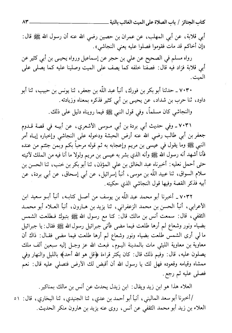 7032 - أَخْبَرَنَا أَبُو مُحَمَّدٍ عَبْدُ اللهِ بْنُ يُوسُفَ، مِنْ أَصْلِ كِتَابِهِ أنبأ أَبُو سَعِيدِ بْنُ الْأَعْرَابِيِّ، أنبأ الْحَسَنُ بْنُ مُحَمَّدٍ الزَّعْفَرَانِيُّ، ثنا يَزِيدُ بْنُ هَارُونَ، أنبأ الْعَلَاءُ أَبُو مُحَمَّدٍ الثَّقَفِيُّ، قَالَ: سَمِعْتُ أَنَسَ بْنَ مَالِكٍ، قَالَ: كُنَّا مَعَ رَسُولِ اللهِ صَلَّى اللهُ عَلَيْهِ وَسَلَّمَ بِتَبُوكَ فَطَلَعَتِ الشَّمْسُ بِضِيَاءٍ وَنُورٍ وَشُعَاعٍ لَمْ أَرَهَا طَلَعَتْ فِيمَا مَضَى، فَأَتَى جَبْرَائِيلُ رَسُولَ اللهِ صَلَّى اللهُ عَلَيْهِ وَسَلَّمَ، فَقَالَ: §" يَا جَبْرَائِيلُ مَا لِي أَرَى الشَّمْسَ طَلَعَتْ بِضِيَاءٍ وَنُورٍ وَشُعَاعٍ لَمْ أَرَهَا طَلَعَتْ فِيمَا مَضَى "، فَقَالَ: ذَاكَ أَنَّ مُعَاوِيَةَ بْنَ مُعَاوِيَةَ اللَّيْثِيَّ مَاتَ بِالْمَدِينَةِ الْيَوْمَ، فَبَعَثَ اللهُ عَزَّ وَجَلَّ إِلَيْهِ سَبْعِينَ أَلْفَ مَلَكٍ يُصَلُّونَ عَلَيْهِ، قَالَ: " وَفِيمَ ذَلِكَ "، قَالَ: كَانَ يُكْثِرُ قِرَاءَةَ {قُلْ هُوَ اللهُ أَحَدٌ} [الإخلاص: 1] بِاللَّيْلِ وَالنَّهَارِ، وَفِي مَمْشَاهُ، وَقِيَامِهِ، وَقُعُودِهِ، فَهَلْ لَكَ يَا رَسُولَ اللهِ أَنْ أَقْبِضَ لَكَ الْأَرْضَ، فَتُصَلِّيَ عَلَيْهِ؟، قَالَ: " نَعَمْ "، فَصَلَّى عَلَيْهِ، ثُمَّ رَجَعَ "، الْعَلَاءُ هَذَا هُوَ ابْنُ زَيْدٍ، وَيُقَالُ: ابْنُ زَيْدَلٍ لَا يُحَدِّثُ عَنْ أَنَسِ بْنِ مَالِكٍ بِمَنَاكِيرَ. أَخْبَرَنَا أَبُو سَعْدٍ الْمَالِينِيُّ، أَنْبَأَ أَبُو أَحْمَدَ بْنُ عَدِيٍّ، ثنا الْجُنَيْدِيُّ، ثنا الْبُخَارِيُّ قَالَ الْعَلَاءُ بْنُ زَيْدٍ أَبُو مُحَمَّدٍ الثَّقَفِيُّ، عَنْ أَنَسٍ رَوَى عَنْهُ يَزِيدُ بْنُ هَارُونَ مُنْكَرُ الْحَدِيثِ -[84]- قَالَ الشَّيْخُ: وَقَدْ رُوِيَ هَذَا الْحَدِيثُ مِنْ وَجْهٍ آخَرَ عَنْ أَنَسٍ