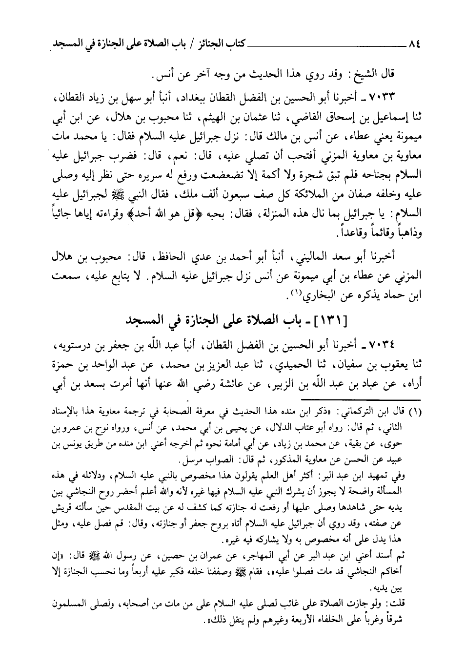 7033 - أَخْبَرَنَا أَبُو الْحُسَيْنِ بْنُ الْفَضْلِ الْقَطَّانُ، بِبَغْدَادَ، أنبأ أَبُو سَهْلِ بْنُ زِيَادٍ الْقَطَّانُ، ثنا إِسْمَاعِيلُ بْنُ إِسْحَاقَ الْقَاضِي، ثنا عُثْمَانُ بْنُ الْهَيْثَمِ، ثنا مَحْبُوبُ بْنُ هِلَالٍ، عَنِ ابْنِ أَبِي مَيْمُونَةَ يَعْنِي عَطَاءً، عَنْ أَنَسِ بْنِ مَالِكٍ، قَالَ: §نَزَلَ جَبْرَائِيلُ عَلَيْهِ السَّلَامُ، فَقَالَ: يَا مُحَمَّدُ مَاتَ مُعَاوِيَةُ بْنُ مُعَاوِيَةَ الْمُزَنِيُّ، أَفَتُحِبُّ أَنْ تُصَلِّيَ عَلَيْهِ؟ قَالَ: " نَعَمْ " قَالَ، فَضَرَبَ جَبْرَائِيلُ عَلَيْهِ السَّلَامُ بِجَنَاحِهِ، فَلَمْ تَبْقَ شَجَرَةٌ، وَلَا أَكَمَةٌ إِلَّا تَضَعْضَعَتْ، وَرَفَعَ لَهُ سَرِيرَهَ حَتَّى نَظَرَ إِلَيْهِ وَصَلَّى عَلَيْهِ، وَخَلْفَهُ صَفَّانِ مِنَ الْمَلَائِكَةِ كُلُّ صَفٍّ سَبْعُونَ أَلْفَ مَلَكٍ، فَقَالَ النَّبِيُّ صَلَّى اللهُ عَلَيْهِ وَسَلَّمَ لِجَبْرَائِيلَ عَلَيْهِ السَّلَامُ: " يَا جَبْرَائِيلُ بِمَا نَالَ هَذِهِ الْمَنْزِلَةَ "، فَقَالَ: بِحُبِّهِ {قُلْ هُوَ اللهُ أَحَدٌ} [الإخلاص: 1] وَقِرَاءَتِهِ إِيَّاهَا جَائِيًا وَذَاهَبًا وَقَائِمًا وَقَاعِدًا " أَخْبَرَنَا أَبُو سَعْدٍ الْمَالِينِيُّ، أنبأ أَبُو أَحْمَدَ بْنُ عَدِيٍّ الْحَافِظُ، قَالَ مَحْبُوبُ بْنُ هِلَالٍ الْمُزَنِيُّ، عَنْ عَطَاءِ بْنِ أَبِي مَيْمُونَةَ، عَنْ أَنَسٍ: نَزَلَ جَبْرَائِيلُ عَلَيْهِ السَّلَامُ. لَا يُتَابَعُ عَلَيْهِ. سَمِعْتُ ابْنَ حَمَّادٍ يَذْكُرُهُ عَنِ الْبُخَارِيِّ