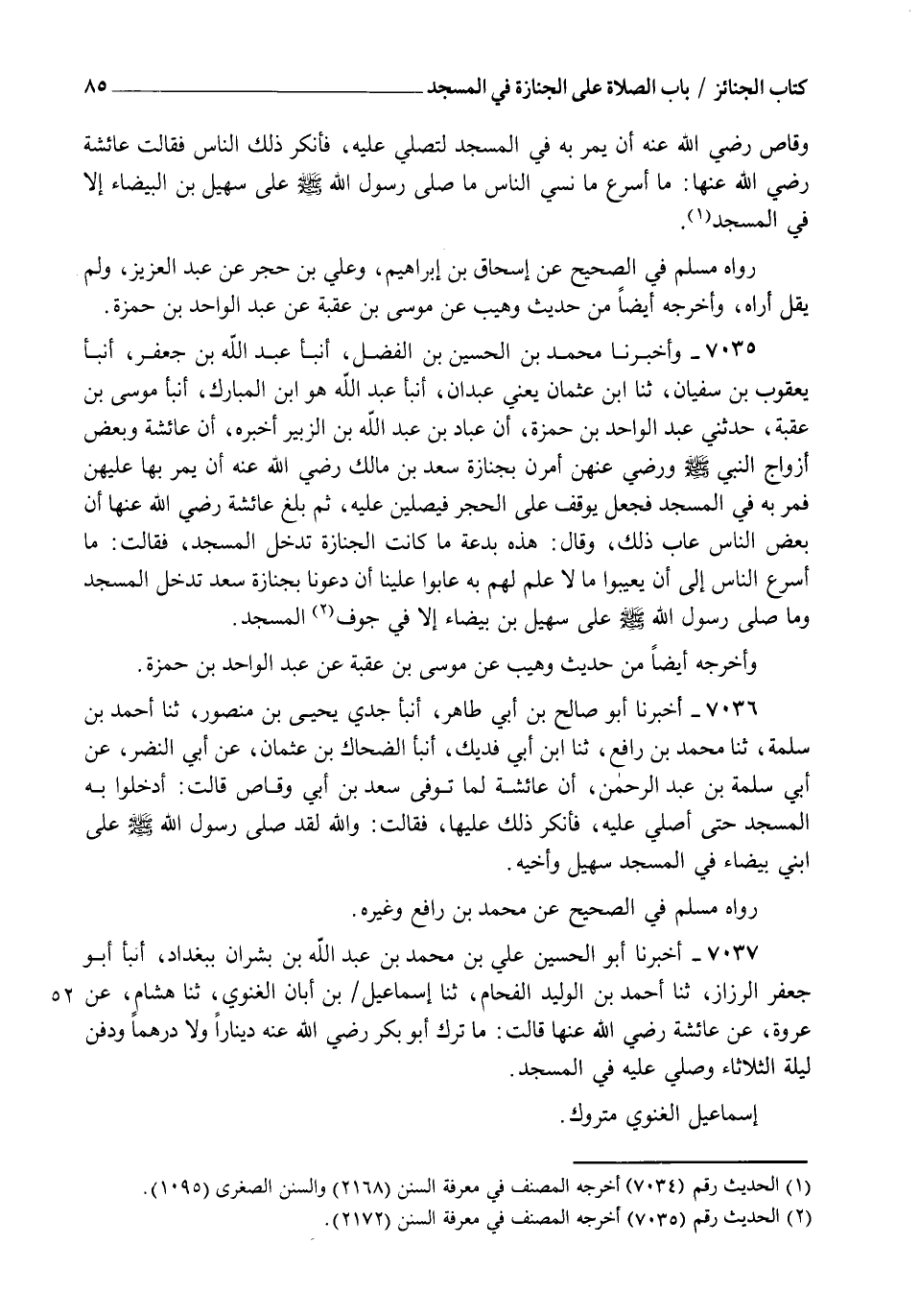 7035 - وَأَخْبَرَنَا مُحَمَّدُ بْنُ الْحُسَيْنِ بْنِ الْفَضْلِ، أنبأ عَبْدُ اللهِ بْنُ جَعْفَرٍ، أنبأ يَعْقُوبُ بْنُ سُفْيَانَ، ثنا ابْنُ عُثْمَانَ يَعْنِي عَبْدَانَ، أنبأ عَبْدُ اللهِ هُوَ ابْنُ الْمُبَارَكِ , أنبأ مُوسَى بْنُ عُقْبَةَ، حَدَّثَنِي عَبْدُ الْوَاحِدِ بْنُ حَمْزَةَ، أَنَّ عَبَّادَ بْنَ عَبْدِ اللهِ بْنِ الزُّبَيْرِ، أَخْبَرَهُ أَنَّ عَائِشَةَ وَبَعْضَ أَزْوَاجِ النَّبِيِّ صَلَّى اللهُ عَلَيْهِ وَسَلَّمَ وَرَضِيَ عَنْهُنَّ أَمَرْنَ بِجِنَازَةِ سَعْدِ بْنِ مَالِكٍ رَضِيَ اللهُ عَنْهُ أَنْ يُمَرَّ بِهَا عَلَيْهِنَّ , فَمُرَّ بِهِ فِي الْمَسْجِدِ فَجُعِلَ يُوقَفُ عَلَى الْحُجَرِ فَيُصَلِّينَ عَلَيْهِ , ثُمَّ بَلَغَ عَائِشَةَ رَضِيَ اللهُ عَنْهَا أَنَّ بَعْضَ النَّاسِ عَابَ ذَلِكَ وَقَالَ: هَذِهِ بِدْعَةٌ مَا كَانَتِ الْجِنَازَةُ تَدْخُلُ الْمَسْجِدَ , فَقَالَتْ: " مَا أَسْرَعَ النَّاسَ إِلَى أَنْ يَعِيبُوا مَا لَا عِلْمَ لَهُمْ بِهِ , عَابُوا عَلَيْنَا أَنْ دَعَوْنَا بِجِنَازَةِ سَعْدٍ تَدْخُلُ الْمَسْجِدَ , §وَمَا صَلَّى رَسُولُ اللهِ صَلَّى اللهُ عَلَيْهِ وَسَلَّمَ عَلَى سُهَيْلِ بْنِ بَيْضَاءَ إِلَّا فِي جَوْفِ الْمَسْجِدِ " وَأَخْرَجَهُ أَيْضًا مِنْ حَدِيثِ وُهَيْبٍ عَنْ مُوسَى بْنِ عُقْبَةَ عَنْ عَبْدِ الْوَاحِدِ بْنِ حَمْزَةَ