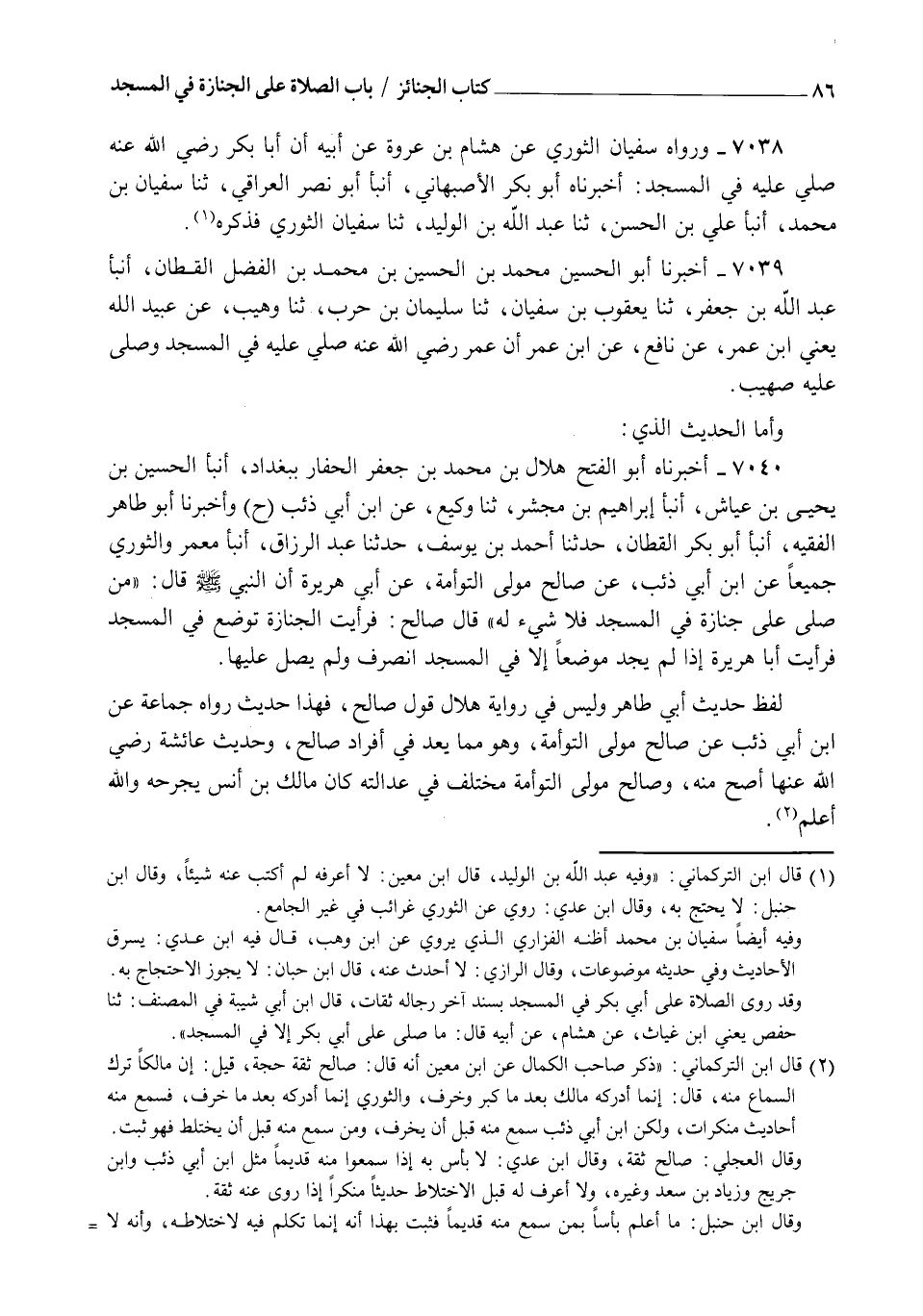 7040 - أَخْبَرَنَاهُ أَبُو الْفَتْحِ هِلَالُ بْنُ مُحَمَّدِ بْنِ جَعْفَرٍ الْحَفَّارُ بِبَغْدَادَ , أنبأ الْحُسَيْنُ بْنُ يَحْيَى بْنِ عَيَّاشٍ، أنبأ إِبْرَاهِيمُ بْنُ مُجَشِّرٍ، ثنا وَكِيعٌ، عَنِ ابْنِ أَبِي ذِئْبٍ وَأَخْبَرَنَا أَبُو طَاهِرٍ الْفَقِيهُ، أنبأ أَبُو بَكْرٍ الْقَطَّانُ، حَدَّثَنَا أَحْمَدُ بْنُ يُوسُفَ، حَدَّثَنَا عَبْدُ الرَّزَّاقِ، أنبأ مَعْمَرٌ، وَالثَّوْرِيُّ جَمِيعًا عَنِ ابْنِ أَبِي ذِئْبٍ، عَنْ صَالِحٍ مَوْلَى التَّوْأَمَةِ , عَنْ أَبِي هُرَيْرَةَ، أَنَّ النَّبِيَّ صَلَّى اللهُ عَلَيْهِ وَسَلَّمَ قَالَ: §" مَنْ صَلَّى عَلَى جِنَازَةٍ فِي الْمَسْجِدِ فَلَا شَيْءَ لَهُ "، قَالَ صَالِحٌ: فَرَأَيْتُ الْجِنَازَةَ تُوضَعُ فِي الْمَسْجِدِ فَرَأَيْتُ أَبَا هُرَيْرَةَ إِذَا لَمْ يَجِدْ مَوْضِعًا إِلَّا فِي الْمَسْجِدِ انْصَرَفَ وَلَمْ يُصَلِّ عَلَيْهَا. لَفْظُ حَدِيثِ أَبِي طَاهِرٍ , وَلَيْسَ فِي رِوَايَةِ هِلَالٍ قَوْلُ صَالِحٍ , فَهَذَا حَدِيثٌ رَوَاهُ جَمَاعَةٌ عَنِ ابْنِ أَبِي ذِئْبٍ عَنْ صَالِحٍ مَوْلَى التَّوْأَمَةِ , وَهُوَ مِمَّا يُعَدُّ فِي إِفْرَادِ صَالِحٍ , وَحَدِيثُ عَائِشَةَ رَضِيَ اللهُ عَنْهَا أَصَحُّ مِنْهُ , وَصَالِحٌ مَوْلَى التَّوْأَمَةِ مُخْتَلَفٌ فِي عَدَالَتِهِ كَانَ مَالِكُ بْنُ أَنَسٍ يُجَرِّحُهُ وَاللهُ أَعْلَمُ