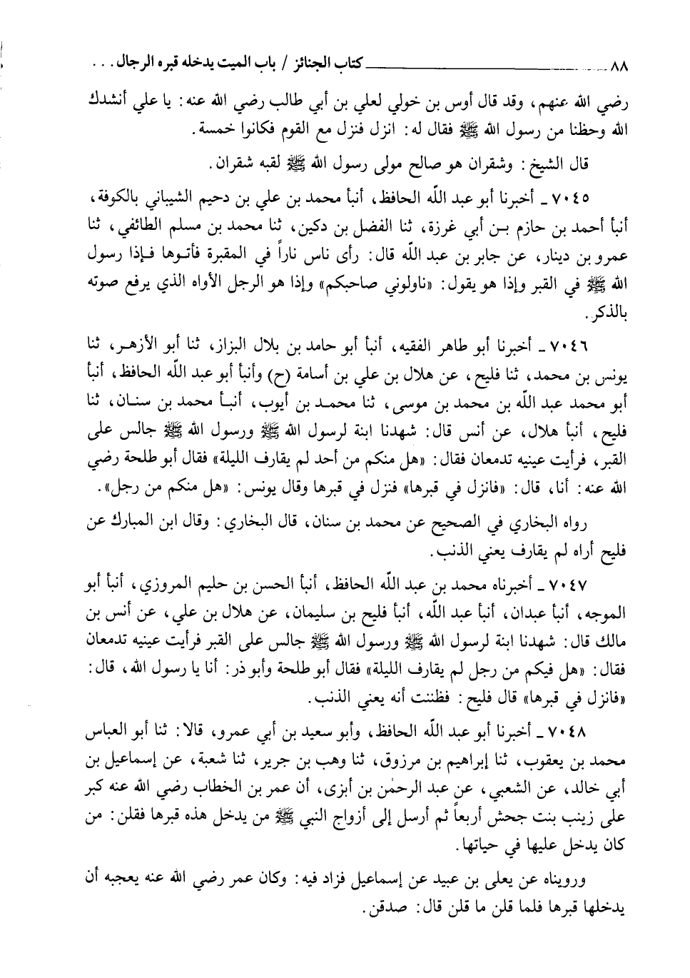 7046 - أَخْبَرَنَا أَبُو طَاهِرٍ الْفَقِيهُ، أنبأ أَبُو حَامِدِ بْنُ بِلَالٍ الْبَزَّازُ، ثنا أَبُو الْأَزْهَرِ، ثنا يُونُسُ بْنُ مُحَمَّدٍ، ثنا فُلَيْحٌ، عَنْ هِلَالِ بْنِ عَلِيِّ بْنِ أُسَامَةَ وَأنبأ أَبُو عَبْدِ اللهِ الْحَافِظُ، أنبأ أَبُو مُحَمَّدٍ عَبْدُ اللهِ بْنُ مُحَمَّدِ بْنِ مُوسَى، ثنا مُحَمَّدُ بْنُ أَيُّوبَ، أنبأ مُحَمَّدُ بْنُ سِنَانٍ، ثنا فُلَيْحٌ، أنبأ هِلَالٌ، عَنْ أَنَسٍ، قَالَ: شَهِدْنَا ابْنَةً لِرَسُولِ اللهِ صَلَّى اللهُ عَلَيْهِ وَسَلَّمَ , وَرَسُولُ اللهِ صَلَّى اللهُ عَلَيْهِ وَسَلَّمَ جَالِسٌ عَلَى الْقَبْرِ فَرَأَيْتُ عَيْنَيْهِ تَدْمَعَانِ فَقَالَ: §" هَلْ مِنْكُمْ مِنْ أَحَدٍ لَمْ يُقَارِفِ اللَّيْلَةَ؟ " فَقَالَ أَبُو طَلْحَةَ رَضِيَ اللهُ عَنْهُ: أَنَا , قَالَ: " فَانْزِلْ فِي قَبْرِهَا " فَنَزَلَ فِي قَبْرِهَا، وَقَالَ يُونُسُ: " هَلْ مِنْكُمْ مِنْ رَجُلٍ " رَوَاهُ الْبُخَارِيُّ فِي الصَّحِيحِ عَنْ مُحَمَّدِ بْنِ سِنَانٍ. قَالَ الْبُخَارِيُّ وَقَالَ ابْنُ الْمُبَارَكِ عَنْ فُلَيْحٍ: أُرَاهُ لَمْ يُقَارِفْ: يَعْنِي الذَّنْبَ