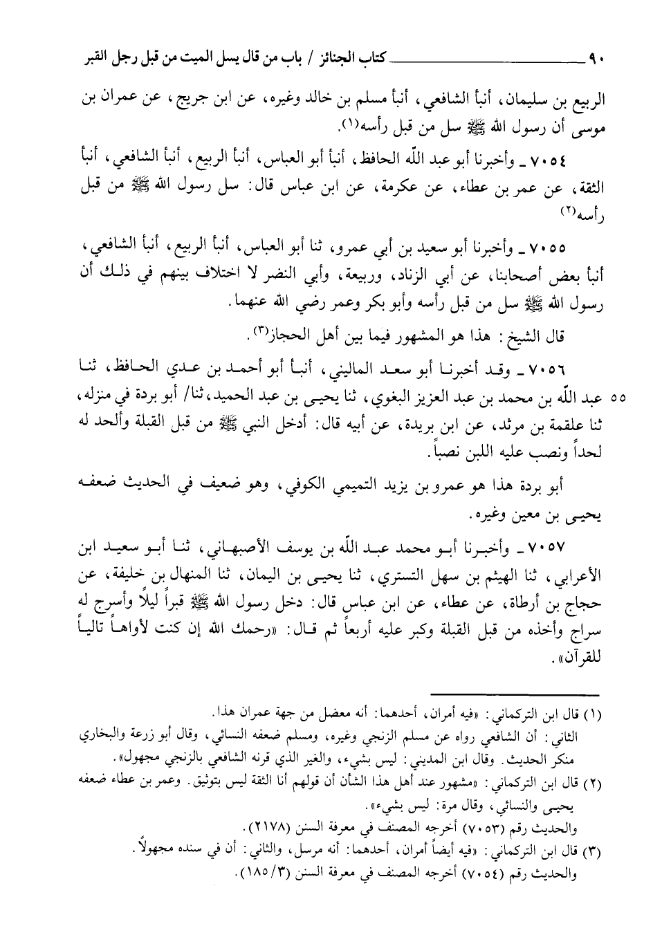 7055 - وَأَخْبَرَنَا أَبُو سَعِيدِ بْنُ أَبِي عَمْرٍو، ثنا أَبُو الْعَبَّاسِ، أنبأ الرَّبِيعُ، أنبأ الشَّافِعِيُّ، أنبأ بَعْضُ أَصْحَابِنَا , عَنْ أَبِي الزِّنَادِ، وَرَبِيعَةَ، وَأَبِي النَّضْرِ، لَا اخْتِلَافَ بَيْنَهُمْ فِي ذَلِكَ: §" أَنَّ رَسُولَ اللهِ صَلَّى اللهُ عَلَيْهِ وَسَلَّمَ سُلَّ مِنْ قِبَلِ رَأْسِهِ وَأَبُو بَكْرٍ , وَعُمَرُ رَضِيَ اللهُ عَنْهُمَا " قَالَ الشَّيْخُ: هَذَا هُوَ الْمَشْهُورُ فِيمَا بَيْنَ أَهْلِ الْحِجَازِ