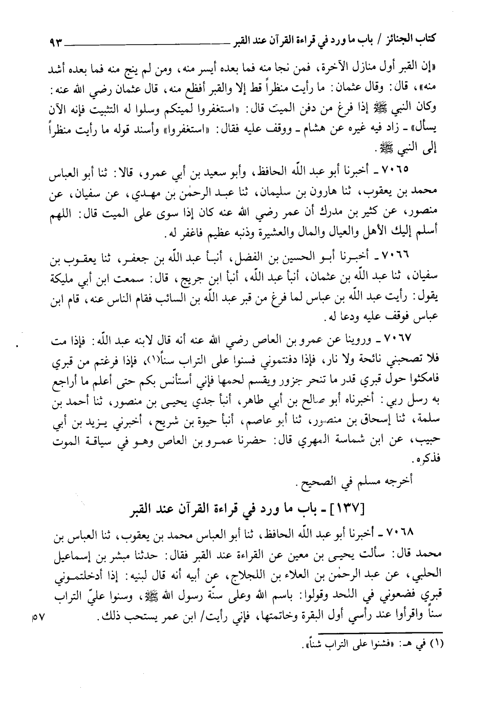 7067 - وَرُوِّينَا عَنْ عَمْرِو بْنِ الْعَاصِ، رَضِيَ اللهُ عَنْهُ أَنَّهُ قَالَ لِابْنِهِ عَبْدِ اللهِ: §" فَإِذَا مِتُّ فَلَا تَصْحَبْنِي نَائِحَةٌ وَلَا نَارٌ فَإِذَا دَفَنْتُمُونِي فَسُنُّوا عَلَيَّ التُّرَابَ سَنًّا , فَإِذَا فَرَغْتُمْ مِنْ قَبْرِي فَامْكُثُوا حَوْلَ قَبْرِي قَدْرَ مَا تُنْحَرُ جَزُورٌ وَيُقَسَّمُ لَحْمُهَا؛ فَإِنِّي أَسْتَأْنِسُ بِكُمْ حَتَّى أَعْلَمَ مَا أُرَاجِعُ بِهِ رُسُلَ رَبِّي " أَخْبَرَنَاهُ أَبُو صَالِحِ بْنُ أَبِي طَاهِرٍ , أنبأ جَدِّي يَحْيَى بْنُ مَنْصُورٍ , ثنا أَحْمَدُ بْنُ سَلَمَةَ , ثنا إِسْحَاقُ بْنُ مَنْصُورٍ , ثنا أَبُو عَاصِمٍ , أنبأ حَيْوَةُ بْنُ شُرَيْحٍ أَخْبَرَنِي يَزِيدُ بْنُ أَبِي حَبِيبٍ عَنِ ابْنِ شِمَاسَةَ الْمَهْرِيِّ قَالَ: حَضَرْنَا عَمْرَو بْنَ الْعَاصِ وَهُوَ فِي سِيَاقَةِ الْمَوْتِ فَذَكَرَهُ. أَخْرَجَهُ مُسْلِمٌ فِي الصَّحِيحِ