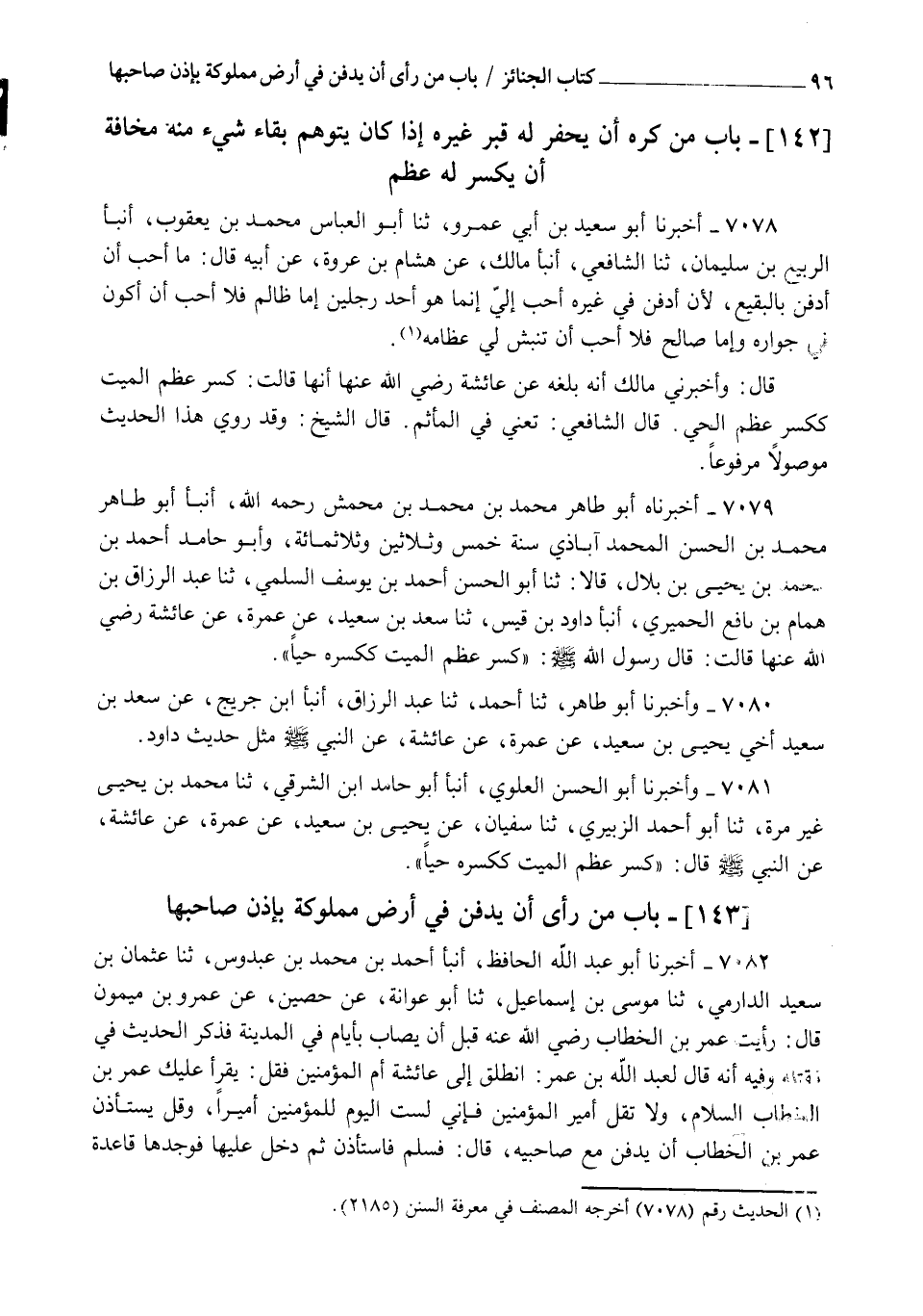 7078 - أَخْبَرَنَا أَبُو سَعِيدِ بْنُ أَبِي عَمْرٍو، ثنا أَبُو الْعَبَّاسِ مُحَمَّدُ بْنُ يَعْقُوبَ , أنبأ الرَّبِيعُ بْنُ سُلَيْمَانَ، ثنا الشَّافِعِيُّ، أنبأ مَالِكٌ، عَنْ هِشَامِ بْنِ عُرْوَةَ، عَنْ أَبِيهِ قَالَ: " §مَا أُحِبُّ أَنْ أُدْفَنَ بِالْبَقِيعِ، لَأَنْ أُدْفَنَ فِي غَيْرِهِ أَحَبُّ إِلَيَّ، إِنَّمَا هُوَ أَحَدُ رَجُلَيْنِ: إِمَّا ظَالِمٌ فَلَا أُحِبُّ أَنْ أَكُونَ فِي جِوَارِهِ , وَإِمَّا صَالِحٌ فَلَا أُحِبُّ أَنْ تُنْبَشَ لِي عِظَامُهُ " قَالَ: وَأَخْبَرَنِي مَالِكٌ أَنَّهُ بَلَغَهُ عَنْ عَائِشَةَ رَضِيَ اللهُ عَنْهَا أَنَّهَا قَالَتْ: " كَسْرُ عَظْمِ الْمَيِّتِ كَكَسْرِ عَظْمِ الْحَيِّ " قَالَ الشَّافِعِيُّ: " تَعْنِي فِي الْمَأْثَمِ " قَالَ الشَّيْخُ: وَقَدْ رُوِيَ هَذَا الْحَدِيثُ مَوْصُولًا مَرْفُوعًا