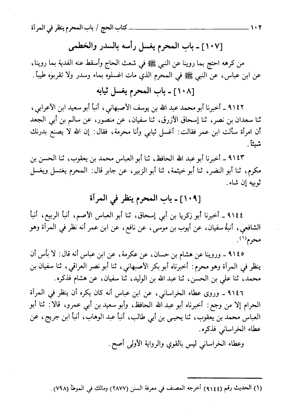9145 - وَرُوِّينَا , عَنْ هِشَامِ بْنِ حَسَّانَ , عَنْ عِكْرِمَةَ , عَنِ ابْنِ عَبَّاسٍ أَنَّهُ قَالَ: §لَا بَأْسَ أَنْ يَنْظُرَ فِي الْمَرْآةِ وَهُوَ مُحْرِمٌ أَخْبَرَنَاهُ أَبُو بَكْرٍ الْأَصْبَهَانِيُّ , ثنا أَبُو نَصْرٍ الْعِرَاقِيُّ , ثنا سُفْيَانُ بْنُ مُحَمَّدٍ , ثنا عَلِيُّ بْنُ الْحَسَنِ , ثنا عَبْدُ اللهِ بْنُ الْوَلِيدِ , ثنا سُفْيَانُ , عَنْ هِشَامٍ فَذَكَرَهُ